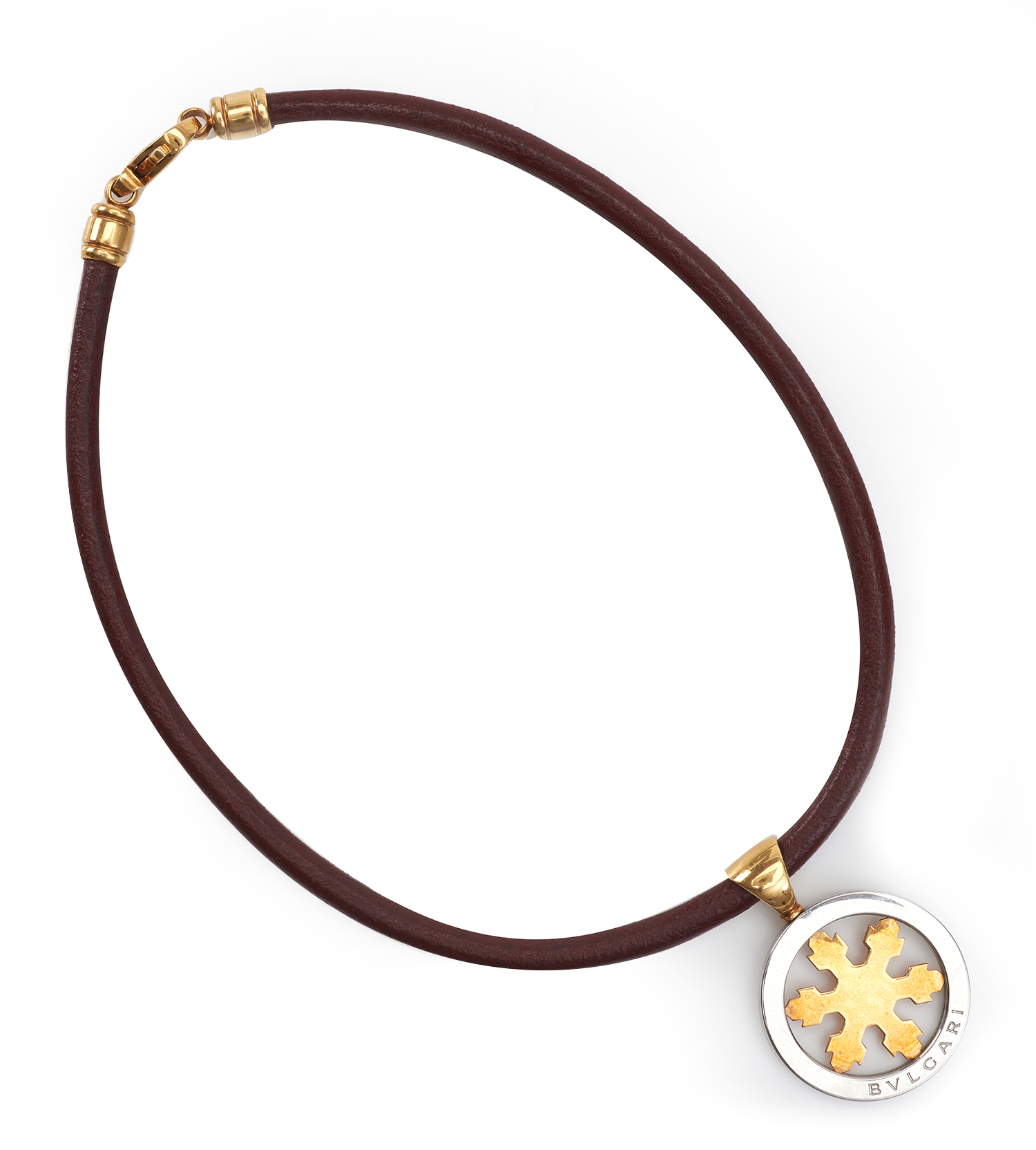The 'Tondo Snowflake' pendant in stainless steel and 18ct gold, to a leather necklace with an 18ct gold clasp.