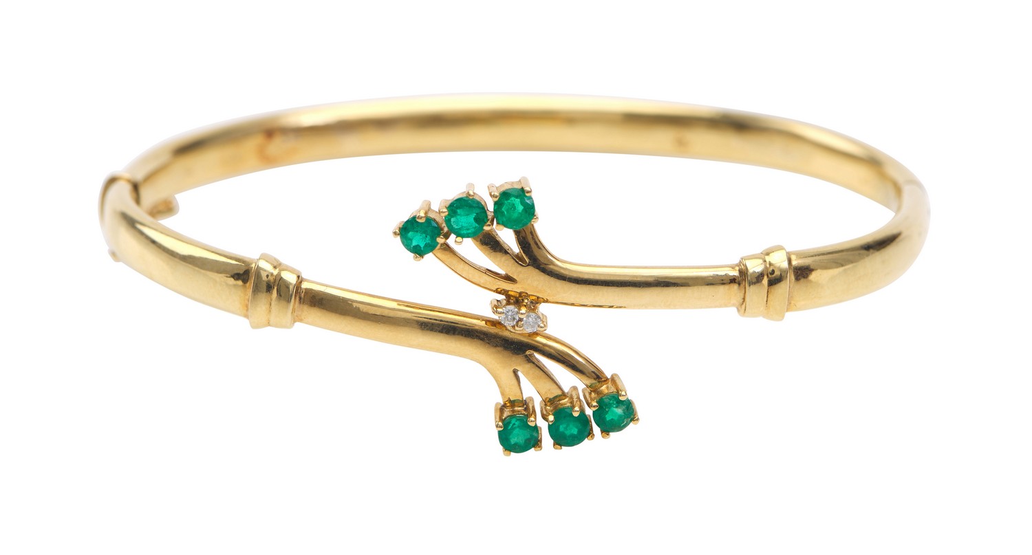 The hinged bangle of crossover style, each terminal with three claw set emeralds, with central diamond detail, in 18ct gold.