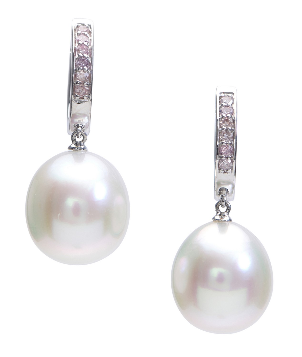 Each earring comprising a drop shaped pearl of white and pink hues, measuring 10.3mm by 11.3mm, suspended on a huggie fitting set with pale pink diamonds, in 18ct white gold.