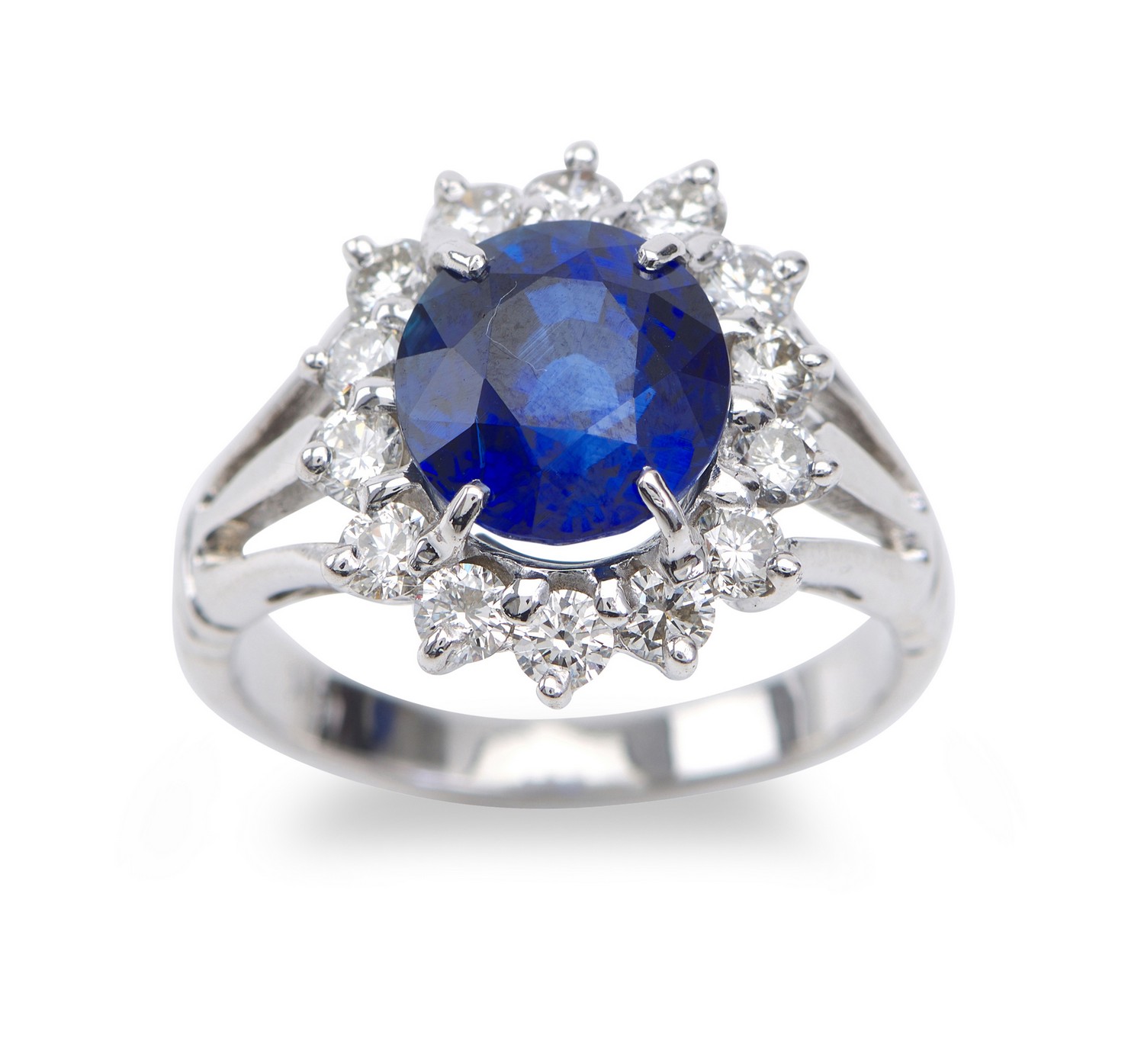 A SAPPHIRE AND DIAMOND CLUSTER RING