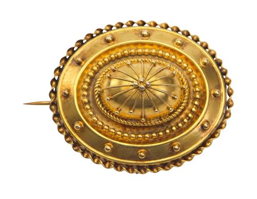 Of Etruscan Revival design, the oval domed brooch with applied bead decoration and glazed locket to verso, in 18ct gold, retailed by Schlager Antiques.