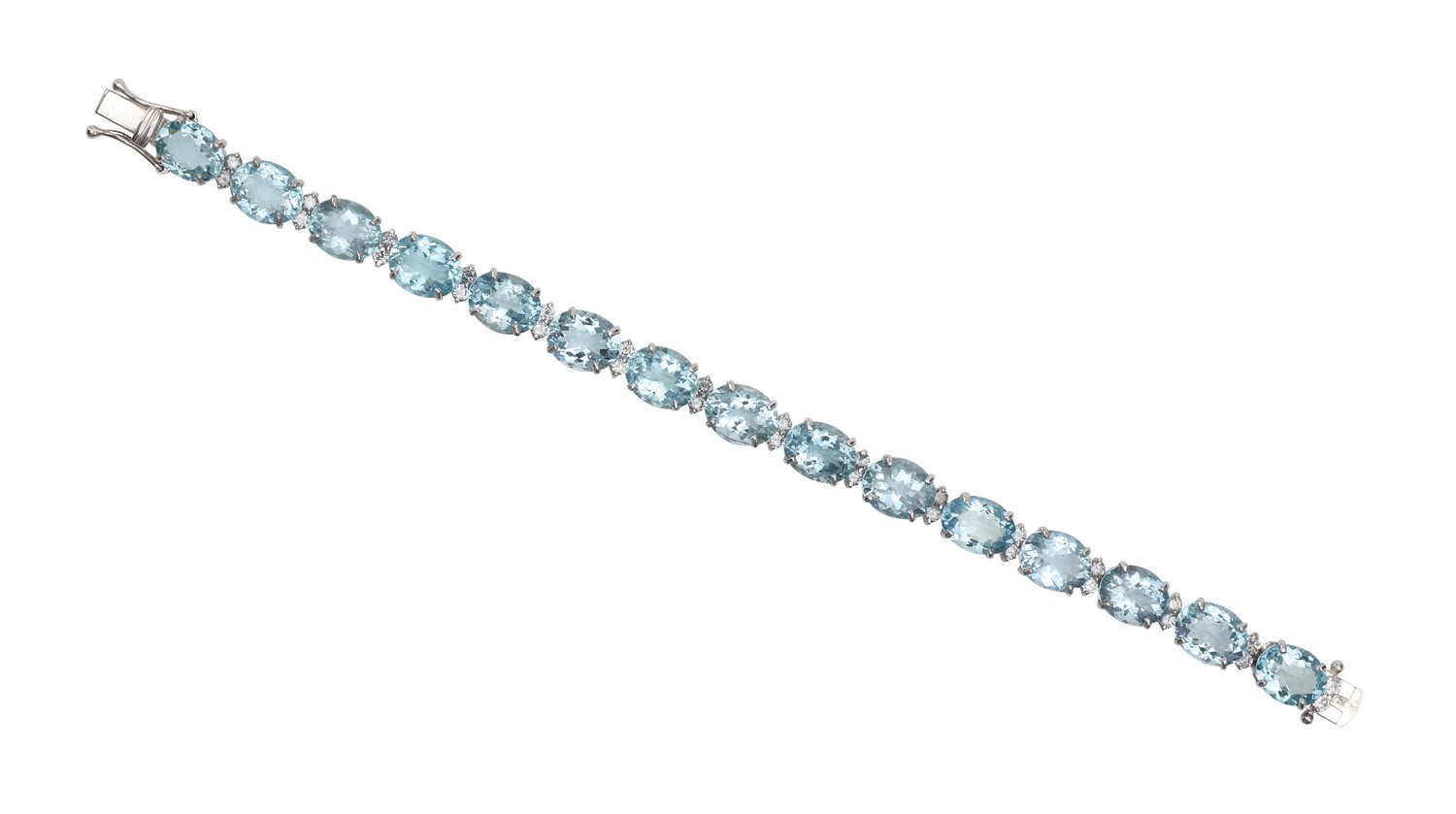 Comprising fifteen oval aquamarines totalling 53.80cts, interspaced by round brilliant cut diamonds totalling 1.90cts, in 18ct white gold, total length 185mm.