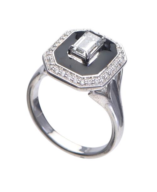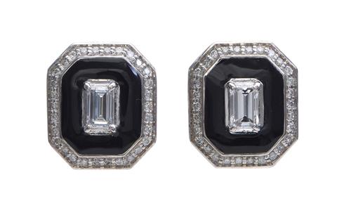 Each octagonal enamel plaque centrally set with a round brilliant cut diamond, with further diamonds to the border, diamonds totalling 3.04cts, ring size N, in 18ct white gold.