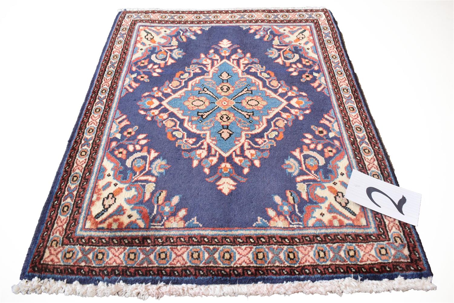 A PERSIAN SAROUQ RUG, 100% WOOL, CLASSIC DESIGN OF BOLD MEDALLION AND CORNER MEDALLIONS IN AN OPEN BLUE FIELD, BORDER OF CROSS SHAPED AND CIRCULAR PATTERNS, SIZE 90 X 60 CM, ORIGIN IRAN, RRP $270