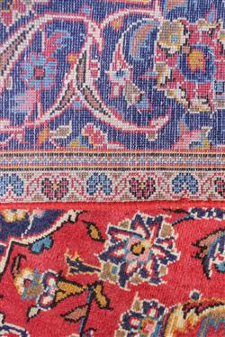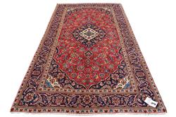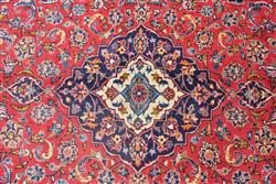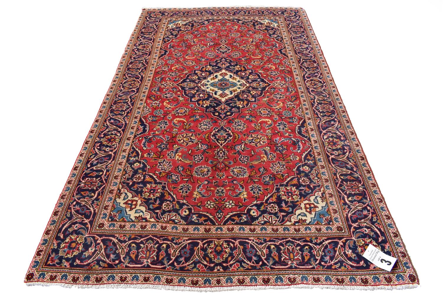A FINELY HAND KNOTTED PERSIAN KASHAN CARPET, 100% WOOL PILE IN EXCELLENT CONDITION, CLASSIC KASHAN BOOK COVER DESIGN OF CHANDELIER SHAPED MEDALLION AND QUARTERED CORNER MEDALLIONS IN A RED FIELD OF SHAH ABBASSI PALMETTES, FLORAL MOTIFS AND TENDRILS, MAJOR BORDER OF PALMETTES AND TENDRILS, MINOR BORDERS OF FLOWER HEADS, SIZE 266 X 150 CM, ORIGIN IRAN, RRP $3,500