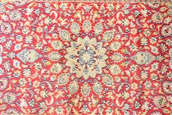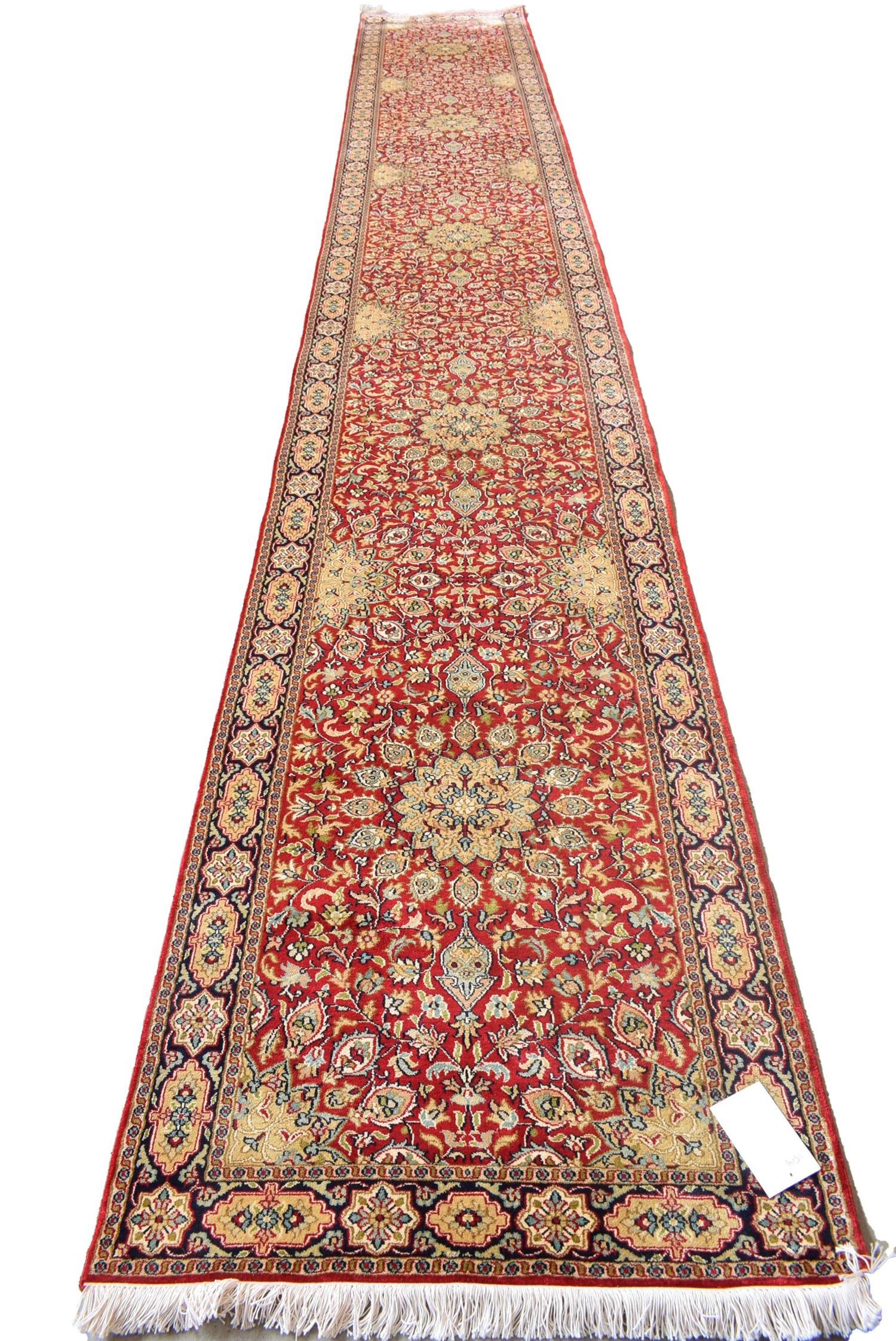 A SUPERFINE PURE SILK KASHMIRI SRINAGAR HALL RUNNER, A RARE EXTRA LONG SILK RUNNER, BRAND NEW AND IN PRISTINE CONDITION, FINELY HAND KNOTTED KASHMIRI SILK WEAVE OF 500,000 KNOTS PER SQUARE METRE, CLASSIC FLORAL DESIGN OF REPEATING SUNBURST MEDALLIONS AND SEMI MEDALLIONS IN A CRIMSON FIELD OF FLORAL SPRAYS AND TENDRILS, BORDER OF CARTOUCHES, SIZE 554 X 81 CM, ORIGIN INDIA, RRP $9,500