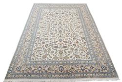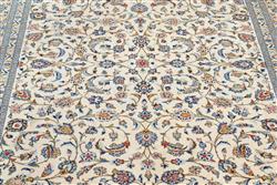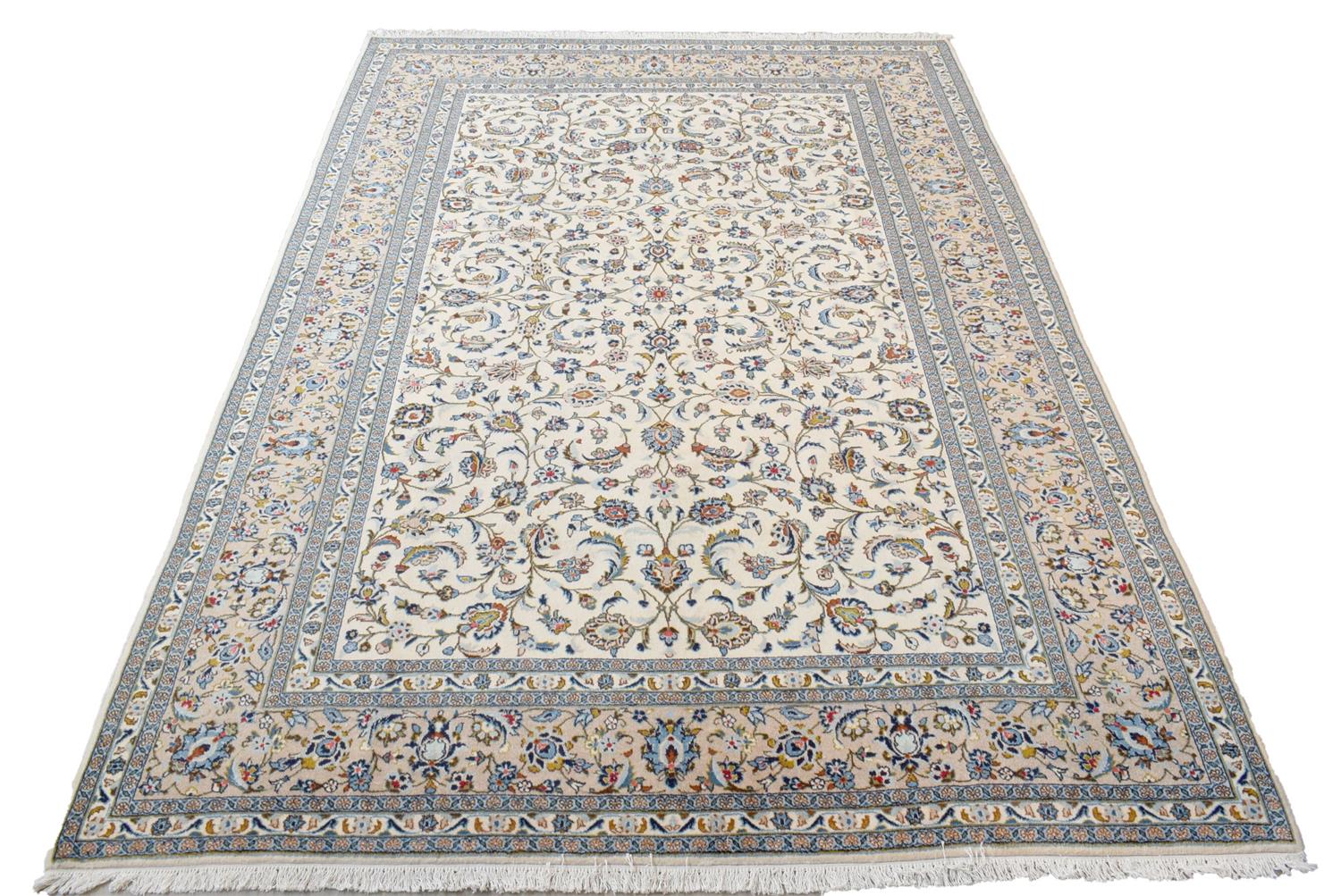 A FINELY HAND KNOTTED PERSIAN KASHAN CARPET, FINE WEAVE, 100% WOOL IN EXCELLENT CONDITION, CLASSIC KASHAN DESIGN OF ALL OVER SHAH ABBASSI PALMETTES, FLORAL MOTIFS AND SAZ LEAVES IN A CREAM FIELD, RARE PATTERNED BORDER OF PALMETTES, FLORAL MOTIFS AND TENDRILS, SIZE 370 X 250 CM, ORIGIN IRAN, RRP $9,200