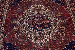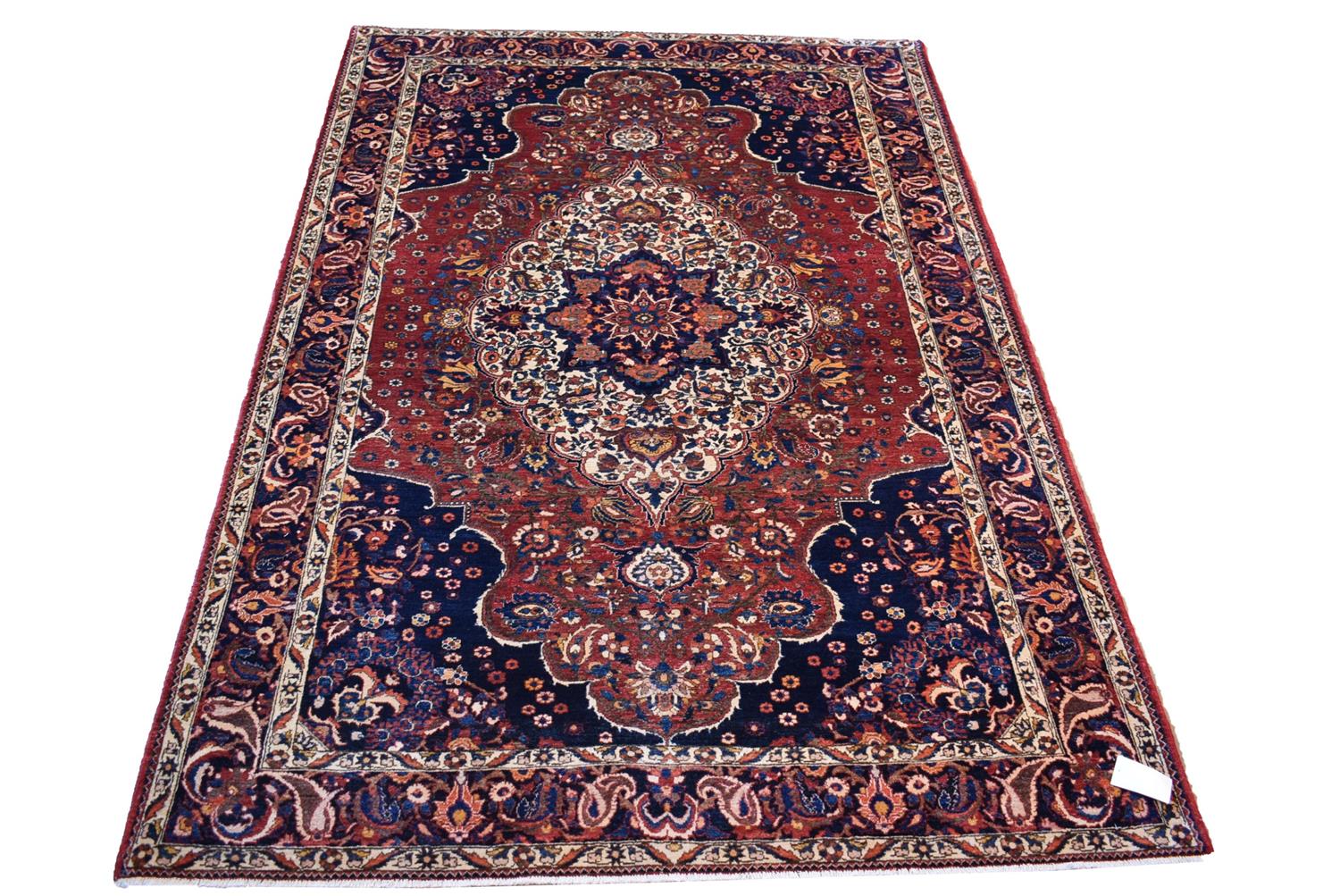 A SUPERFINE, RARE AND COLLECTABLE TRIBAL PERSIAN BAKHTIAR CHAHALSHOTOR CARPET, 100% DENSE WOOL PILE IN PRISTINE CONDITION, FINELY HAND KNOTTED TRIBAL WEAVE, TRIBAL BAKHTIARI DESIGN OF PENDANTED MEDALLION SET WITHIN A SECOND BOLD MEDALLION OF FLORAL MOTIFS AND QUARTERED CORNER MEDALLIONS WITH URNS BEARING FLORAL FOLIAGE SET WITHIN A RED FIELD OF PALMETTES, FLORAL MOTIFS AND PAISLEY PATTERNS, BORDER OF PALMETTES AND TENDRILS, SIZE 301 X 208 CM, ORIGIN IRAN, RRP $8,200
