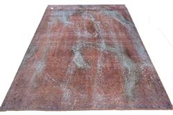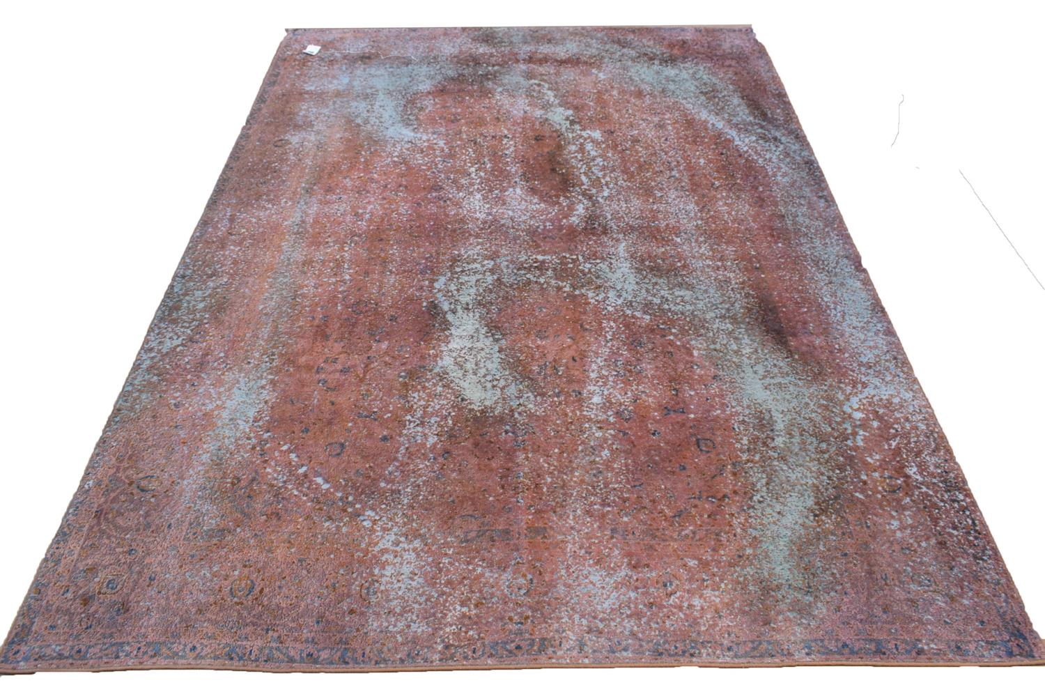 A CONTEMPORARY OVER DYED AND HAND CARVED VINTAGE PERSIAN TABRIZ CARPET, VINTAGE HAND CARVED PILE, UNIQUE, ONE OF A KIND MODERN CARPET CREATED FROM A VINTAGE HAND KNOTTED PERSIAN TABRIZ CARPET WITH DISTRESSED HAND CARVED PATTERNS, OVER DYED IN MODERN TONES OF TURQUOISE AND ROSE, SIZE 397 X 287 CM, ORIGIN IRAN, RRP $5,500