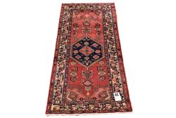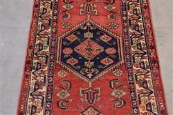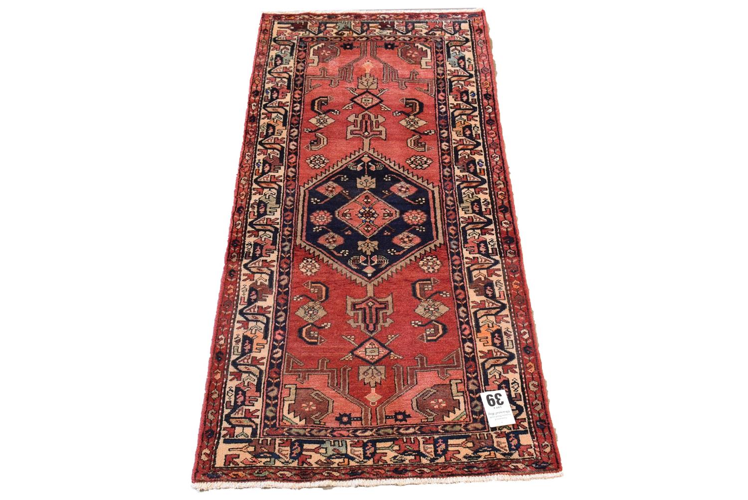 A TRIBAL PERSIAN BAKHTIAR RUG, 100% WOOL IN EXCELLENT CONDITION, HAND KNOTTED TRIBAL WEAVE AND DESIGN OF BOLD ANCHORED MEDALLION AND CORNER MEDALLIONS IN A RED FIELD OF FLORAL PATTERNS, BORDER OF LEAF FORMS, SIZE 209 X 94 CM, ORIGIN IRAN, RRP $1,100