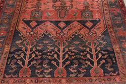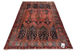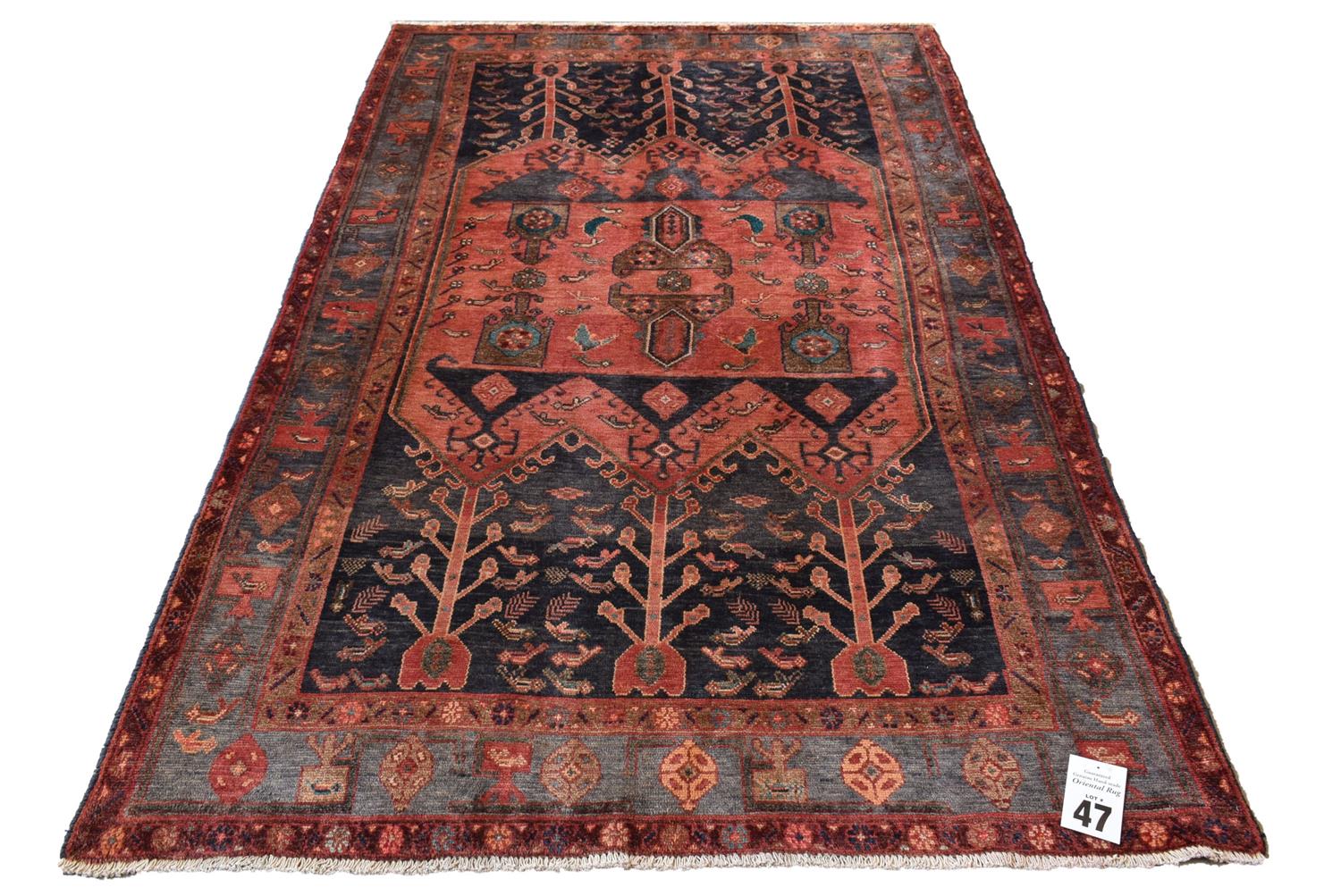 A NOMADIC PERSIAN SHAHSAVAN RUG, 100% WOOL IN EXCELLENT CONDITION, HAND KNOTTED NOMADIC WEAVE AND DESIGN OF BOLD ANGULAR MEDALLION IN A FIELD OF 'TREE OF LIFE' PATTERNS AND BIRD FORMS, BORDER OF ROSETTES, SIZE 232 X 145 CM, ORIGIN IRAN, RRP $2,100