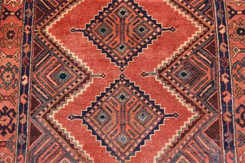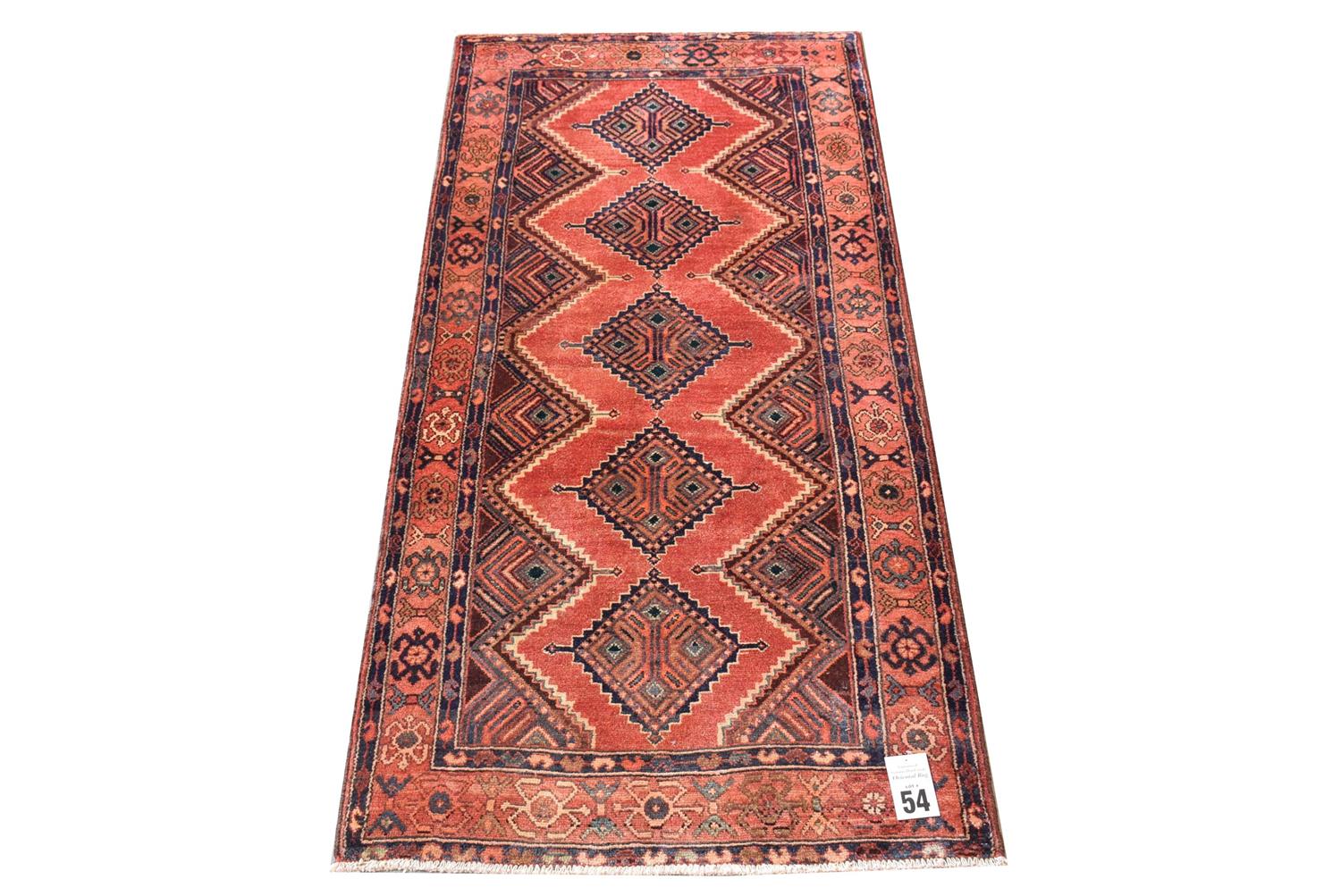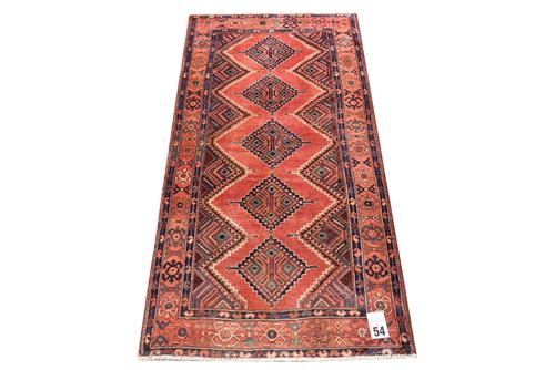 A FINELY HAND KNOTTED PERSIAN ZAGHEH RUG, 100% DENSE WOOL PILE IN EXCELLENT CONDITION, VILLAGE WEAVE WITH TRIBAL DESIGN OF ANCHORED DIAMOND SHAPED MEDALLIONS AND SEMI MEDALLIONS IN AN OPEN RED FIELD, BORDER OF TRIBAL MOTIFS, SIZE 224 X 109 CM, ORIGIN IRAN, RRP $1,600