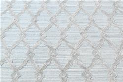A LARGE MODERN FLATWEAVE RUG, WOOL AND SILK TEXTURE, MODERN DESIGN OF PLUSH EMBOSSED INTERTWINED PATTERNS IN A CREAM AND SEA GREEN FIELD, SIZE 397 X 309 CM, ORIGIN INDIA, RRP $3,800