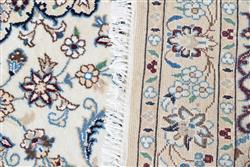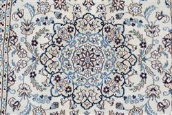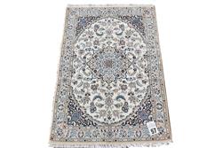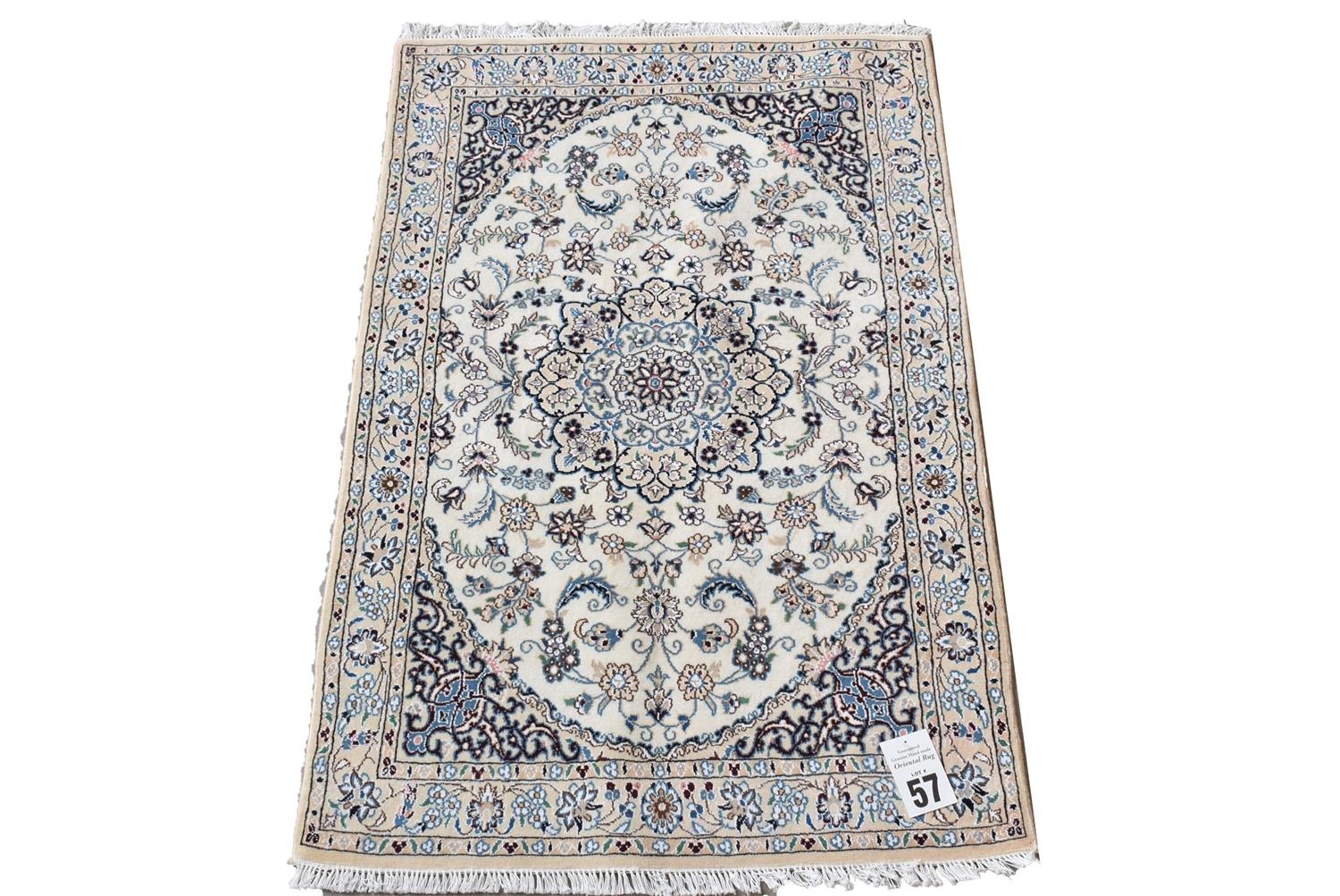 A FINELY HAND KNOTTED PERSIAN NAIEN CARPET, SILK INTER KNOTS WITHIN A WOOL PILE IN PRISTINE CONDITION, CLASSIC NAIEN DESIGN OF FLORAL MEDALLION AND QUARTERED CORNER MEDALLIONS IN A CREAM FIELD OF FLORAL SPRAYS AND TENDRILS, BORDER OF PALMETTES, ROSETTES AND FLORAL SPRAYS, SIZE 153 X 100 CM, ORIGIN IRAN, RRP $2,400