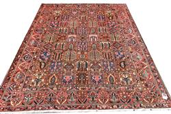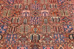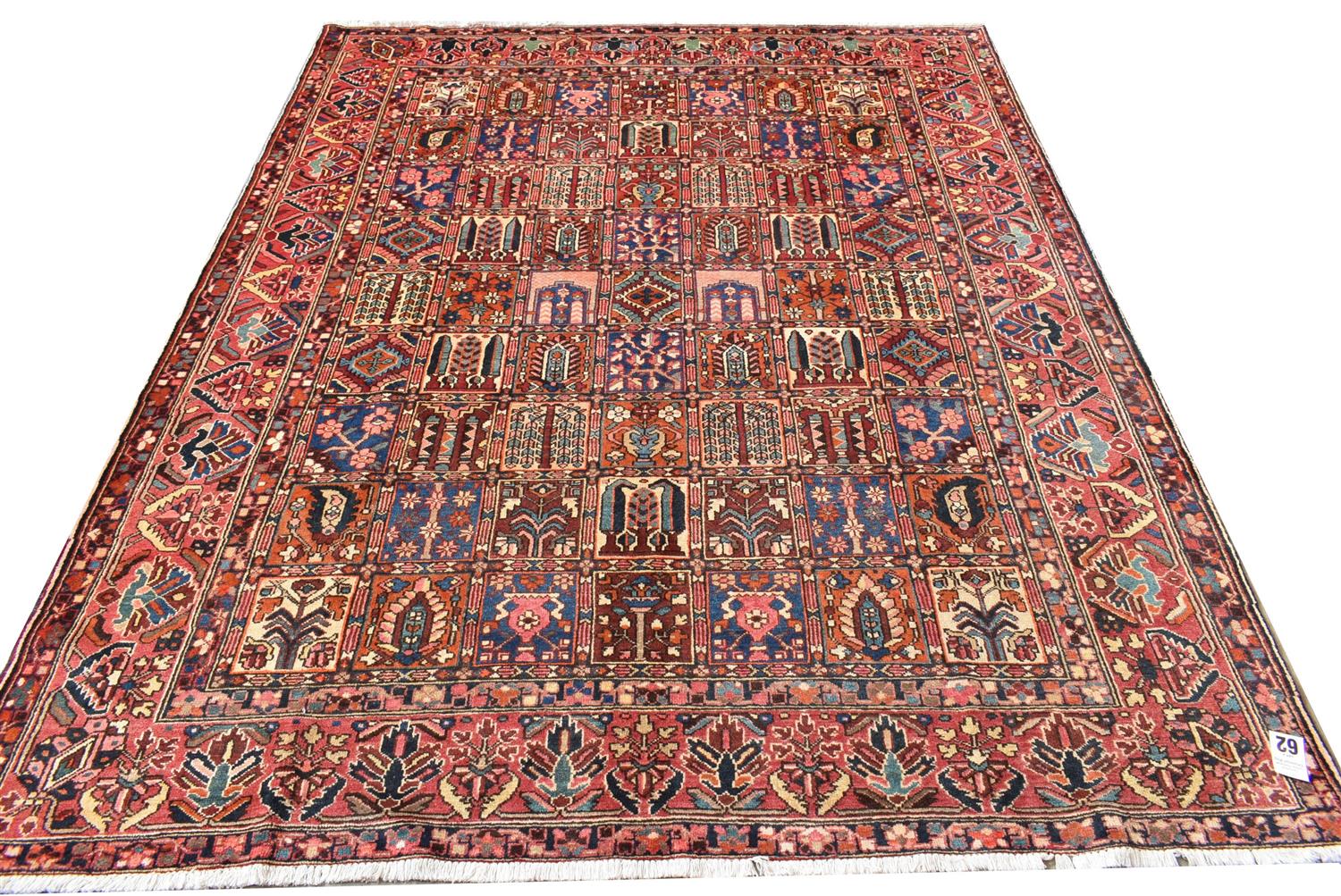 A LARGE HAND KNOTTED TRIBAL PERSIAN BAKHTIAR SHAHR-E KURD CARPET, 100% DENSE WOOL PILE IN EXCELLENT CONDITION, TRIBAL 'GARDEN' DESIGN WITH PANELS CONTAINING VARYING GARDEN THEMES OF CYPRESS AND WILLOW TREES, URNS WITH FLORAL FOLIAGE, FLORAL PAISLEY PATTERNS, FLORAL SHRUBS AND PRAYER NICHES, BORDER OF ALTERNATING STYLISED PALMETTES AND URNS BEARING FLORAL FOLIAGE, SIZE 380 X 306 CM, ORIGIN IRAN, RRP $9,800