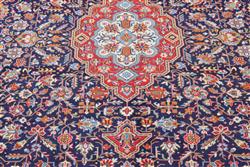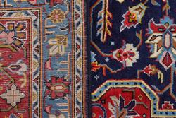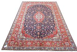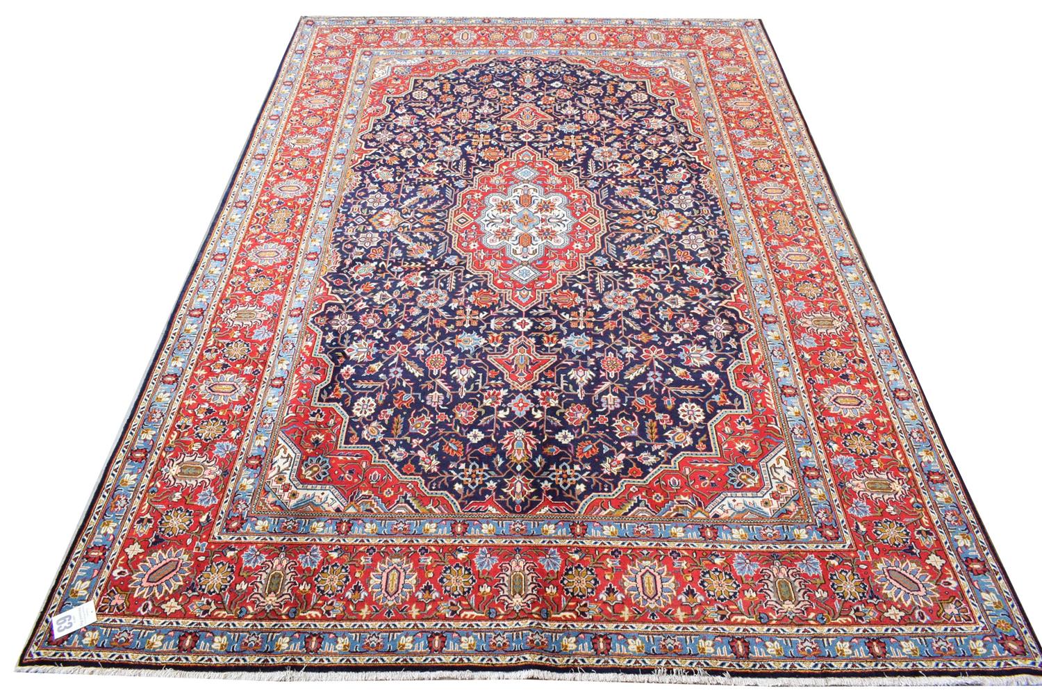 A RARE HAND KNOTTED PERSIAN KASHAN CARPET, 100% WOOL IN EXCELLENT CONDITION, KASHAN WEAVE WITH RARE TABRIZ DESIGN OF BOLD ANGULAR AND ANCHORED MEDALLION AND QUARTERED CORNER MEDALLIONS IN A NAVY BLUE FIELD OF STYLISED PALMETTES, FLORAL MOTIFS AND TENDRILS, WIDE BORDER OF PALMETTES, ROSETTES AND FLORAL MOTIFS, SIZE 380 X 278 CM, ORIGIN IRAN, RRP $10,500