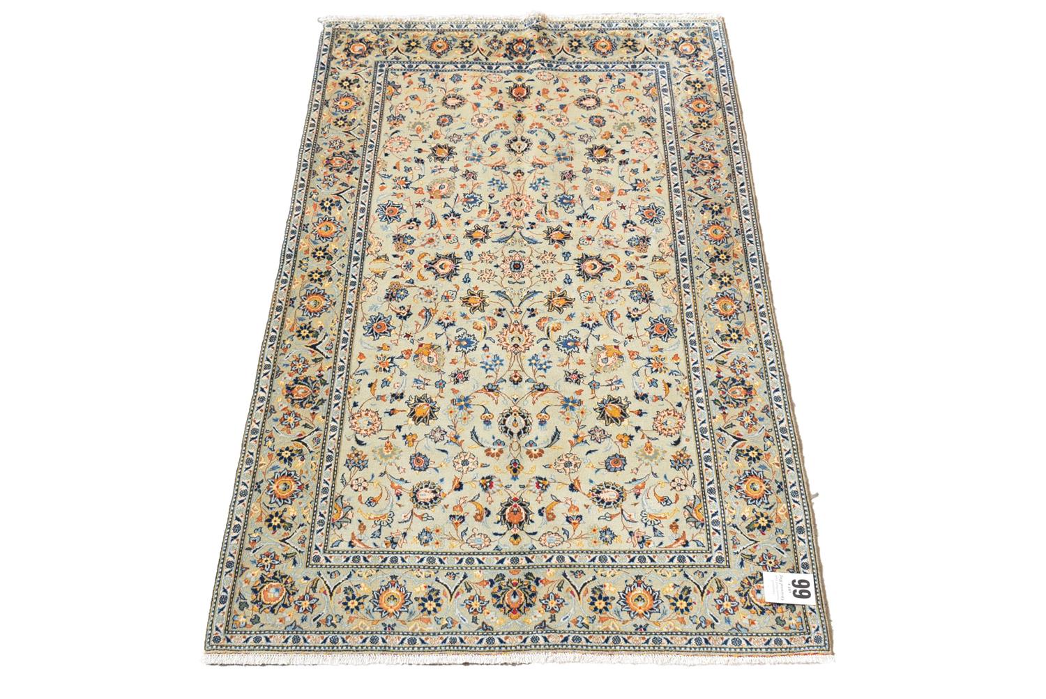 A FINELY HAND KNOTTED AND COLLECTABLE PERSIAN KASHAN CARPET, 100% WOOL IN EXCELLENT CONDITION, CLASSIC KASHAN DESIGN OF ALL OVER SHAH ABBASSI PALMETTES, FLORAL MOTIFS AND TENDRILS IN A PISTACHIO TONED FIELD, BORDER OF PALMETTES AND FLORAL MOTIFS, SIZE 212 X 134 CM, ORIGIN IRAN, RRP $4,200