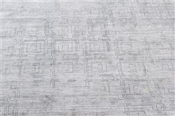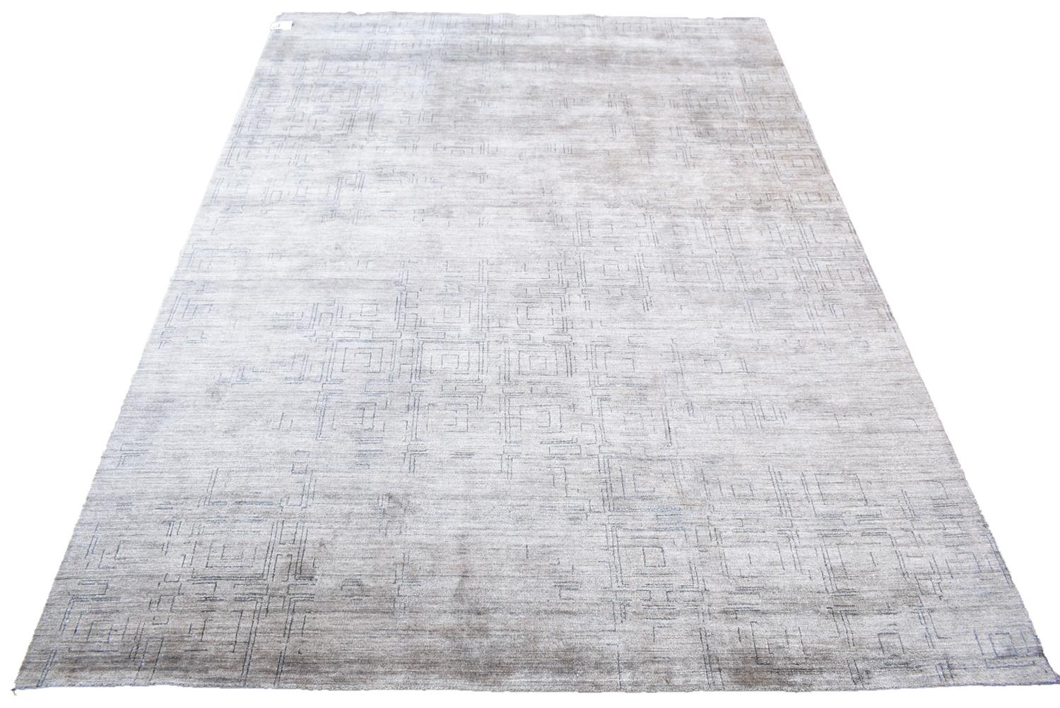 A NEW MODERN SILK TEXTURED CARPET, SOLID AND DENSE PILE IN PRISTINE CONDITION, WITH ALL OVER BLUE TONED, SQUARE SHAPED GEOMETRIC PATTERNS IN A BROWN FIELD, SIZE 366 X 273 CM, ORIGIN INDIA, RRP $5,900