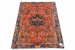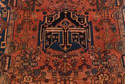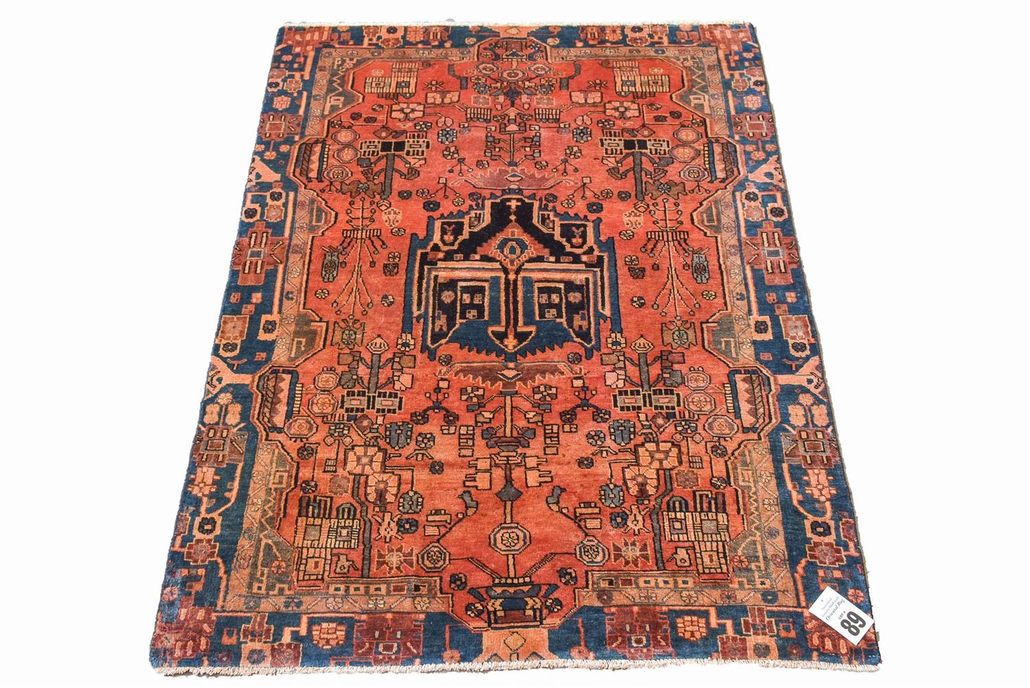 A TRIBAL PERSIAN NAHAVAND, 100% WOOL, HAND KNOTTED VILLAGE WEAVE FROM THE HAMADAN REGION WITH TRIBAL DESIGN OF ANGULAR MEDALLION AND CORNER MEDALLIONS IN A RED FIELD OF FLORAL PATTERNS, SIZE 205 X 145 CM, ORIGIN IRAN, RRP $1,600