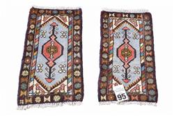 A PAIR OF PERSIAN HAMADAN RUGS, 100% WOOL, VILLAGE WEAVE WITH TRIBAL DESIGN OF ANCHORED MEDALLION AND CORNER MEDALLIONS CONTAINING BIRD FORMS, BORDER OF FLOWER HEADS AND BUTTERFLIES, SIZE 50 X 30 CM, ORIGIN IRAN, RRP $190