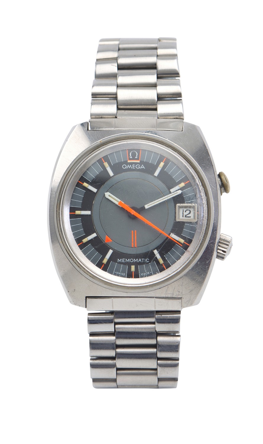 Automatic movement, circular grey and black dial with white and orange baton numerals and hands, signed case,dial and movement, date aperture at three, alarm, tonneau shaped stainless steel case with conforming stainless steel bands, diameter 40mm.