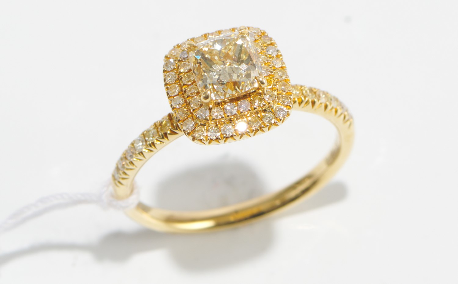 A YELLOW DIAMOND RING IN 18CT GOLD, CENTRING A CUSHION CUT DIAMOND WEIGHING 1.00CT, WITHIN A SURROUND OF ROUND BRILLIANT CUT DIAMONDS TOTALLING 0.27CT, SIZE L, 3.6GMS