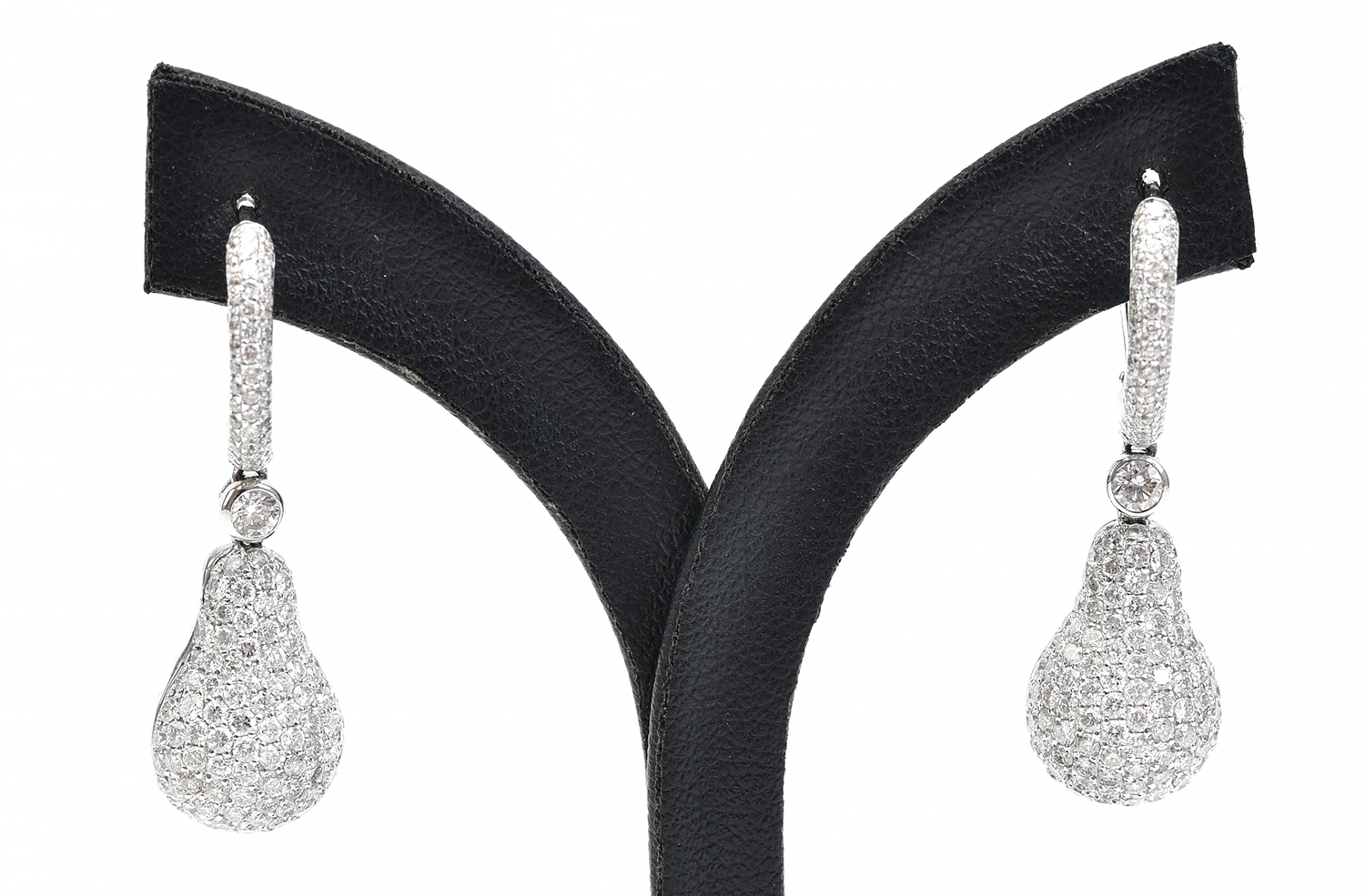 A PAIR OF DIAMOND EARRINGS, THE PEAR SHAPED DROPS TO LEVER BACK HOOK FITTINGS, TOTALLING 3.48CTS, IN 18CT WHITE GOLD, LENGTH 30MM, 8.2GMS