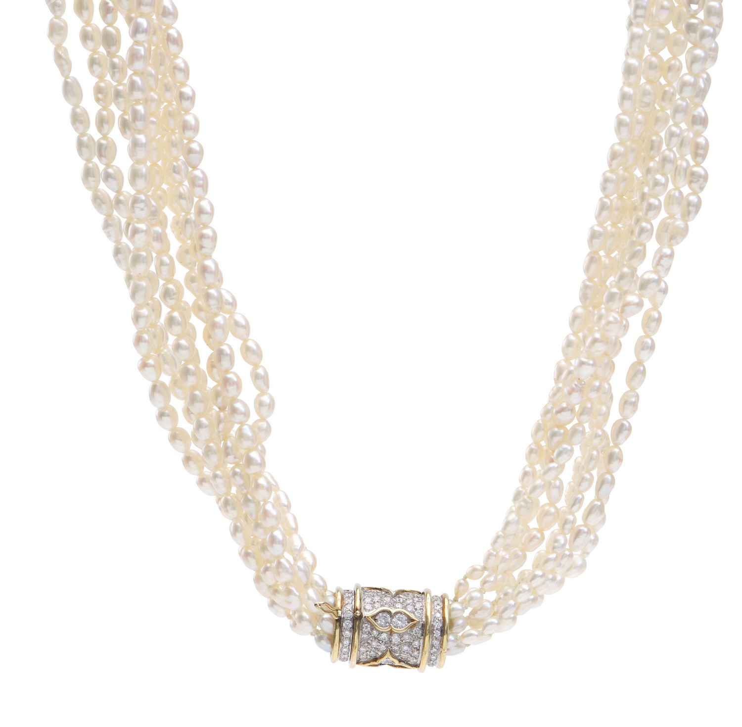 Comprising eight strands of pearls to a barrel clasp set with round brilliant cut diamonds, in 14ct gold, total length 700mm.