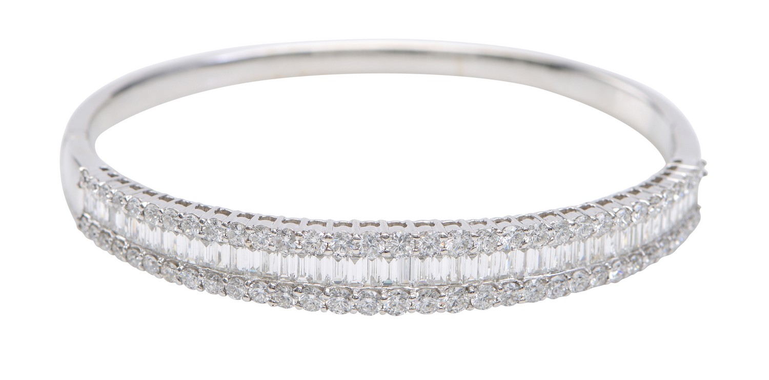 The hinged bangle set with a central row of baguette cut diamonds, bordered by round brilliant cut diamonds, altogether totalling an estimated 5.0cts, in 18ct white gold.
