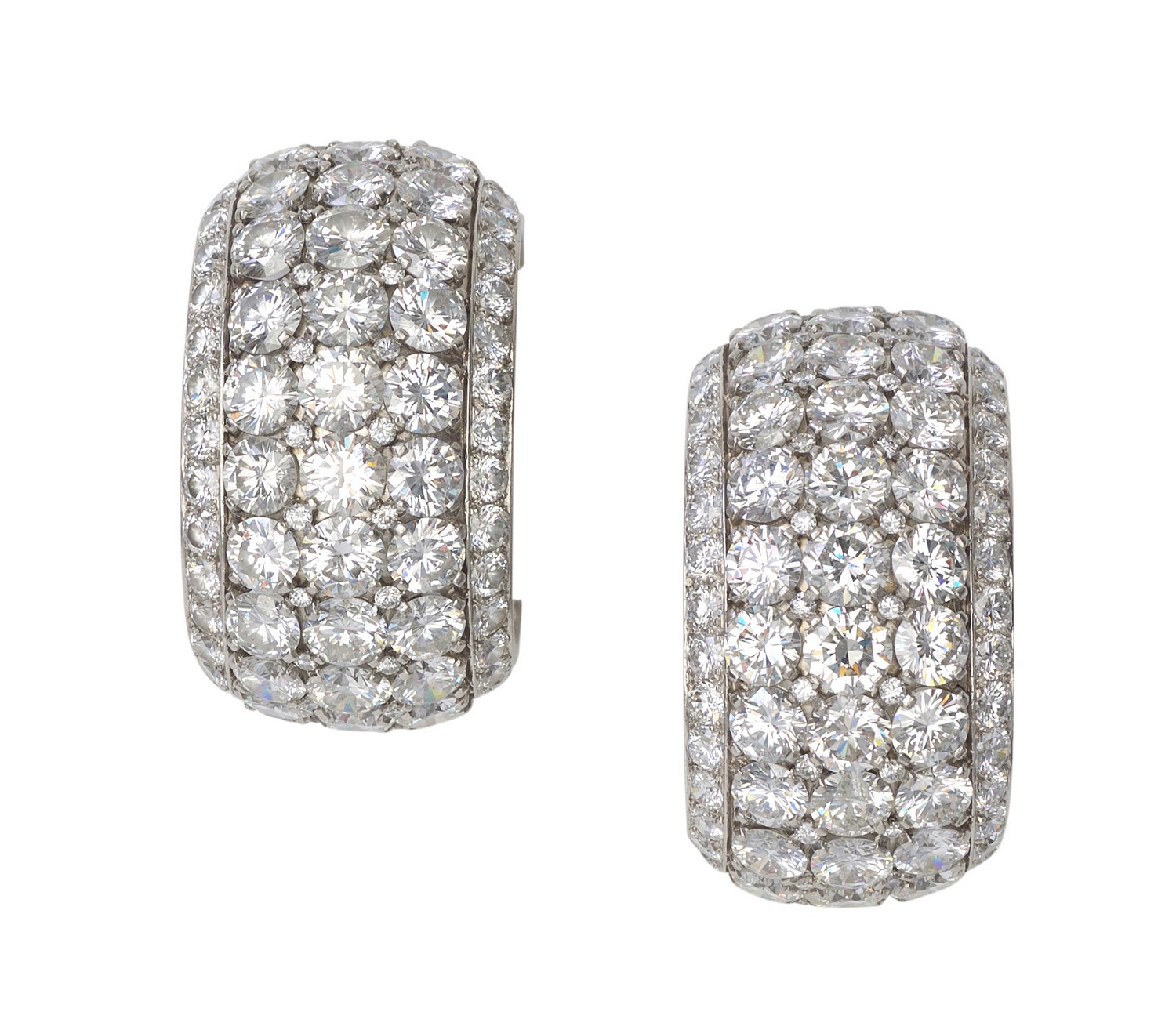 Each large hoop set to the centre with thirty nine round brilliant cut diamonds totalling an estimated 10.26cts, bordered by smaller diamonds totalling an estimated 2.0cts, the larger diamonds spaced with fine diamond detail totalling 0.12cts, signed, in platinum, circa 1955.
