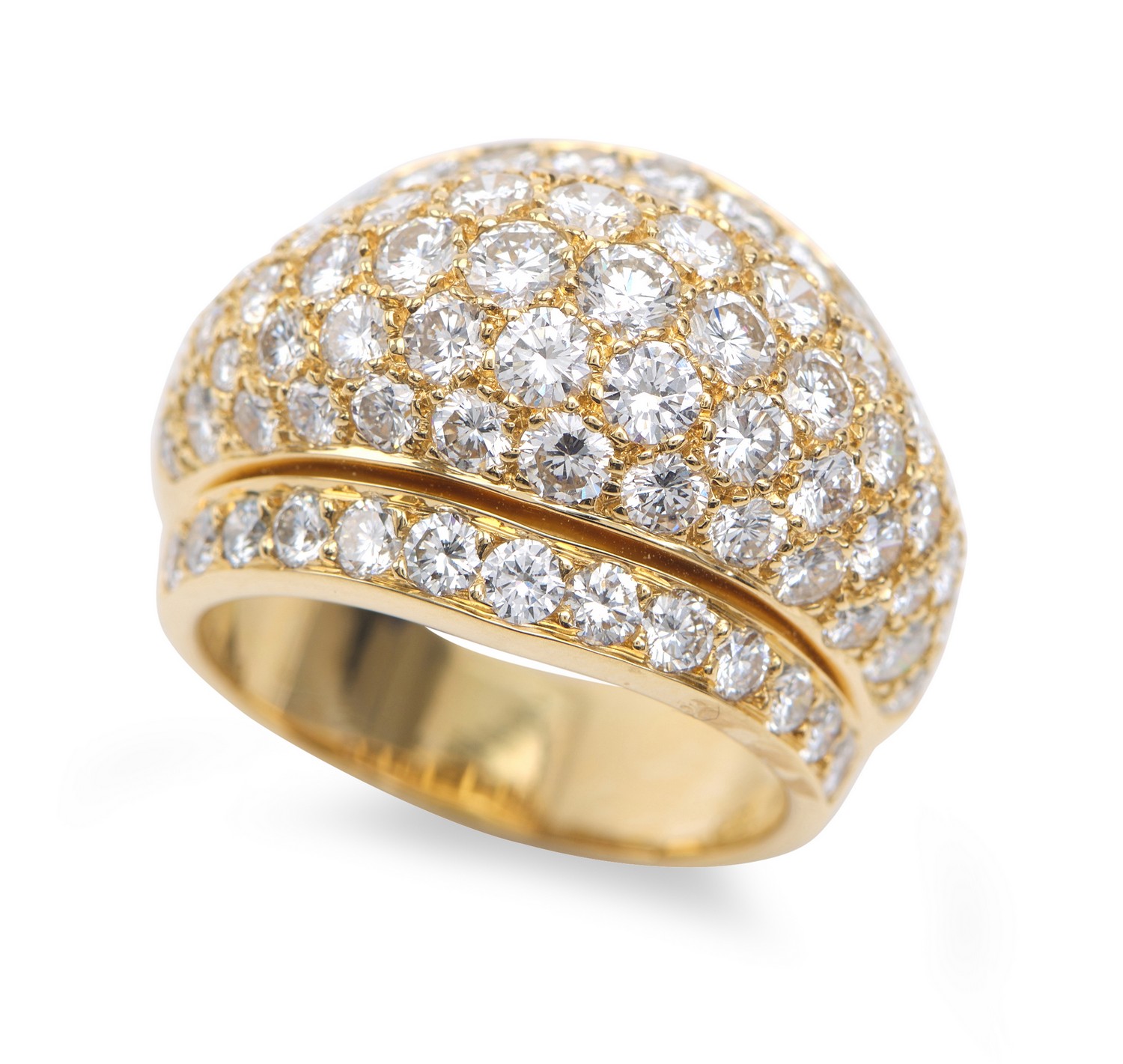 The wide domed band set with round brilliant cut diamonds, signed and numbered 636942, in 18ct gold, ring size M, circa 1960.