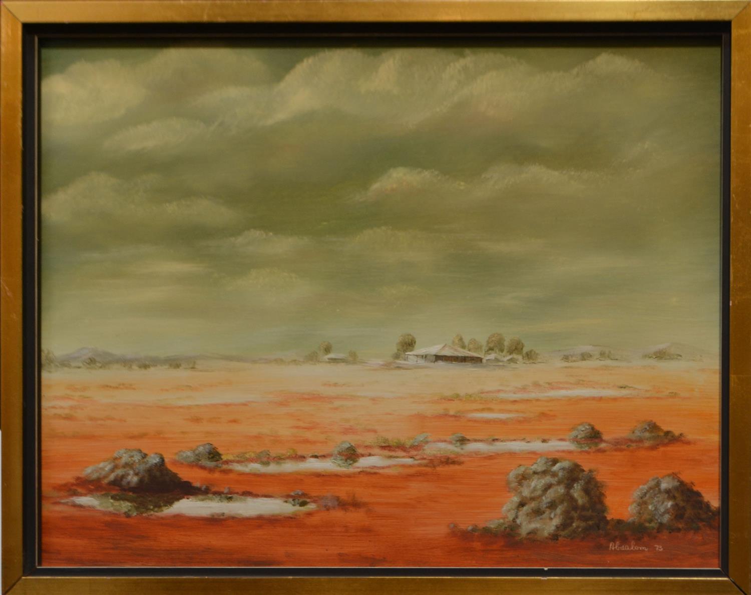 JACK ABSALOM, OUT STATION 1973, OIL ON BOARD, 34.5 X 44.5CM, FRAME SIZE: 39 X 49CM, CONDITION: MINOR SURFACE SCRATCHES