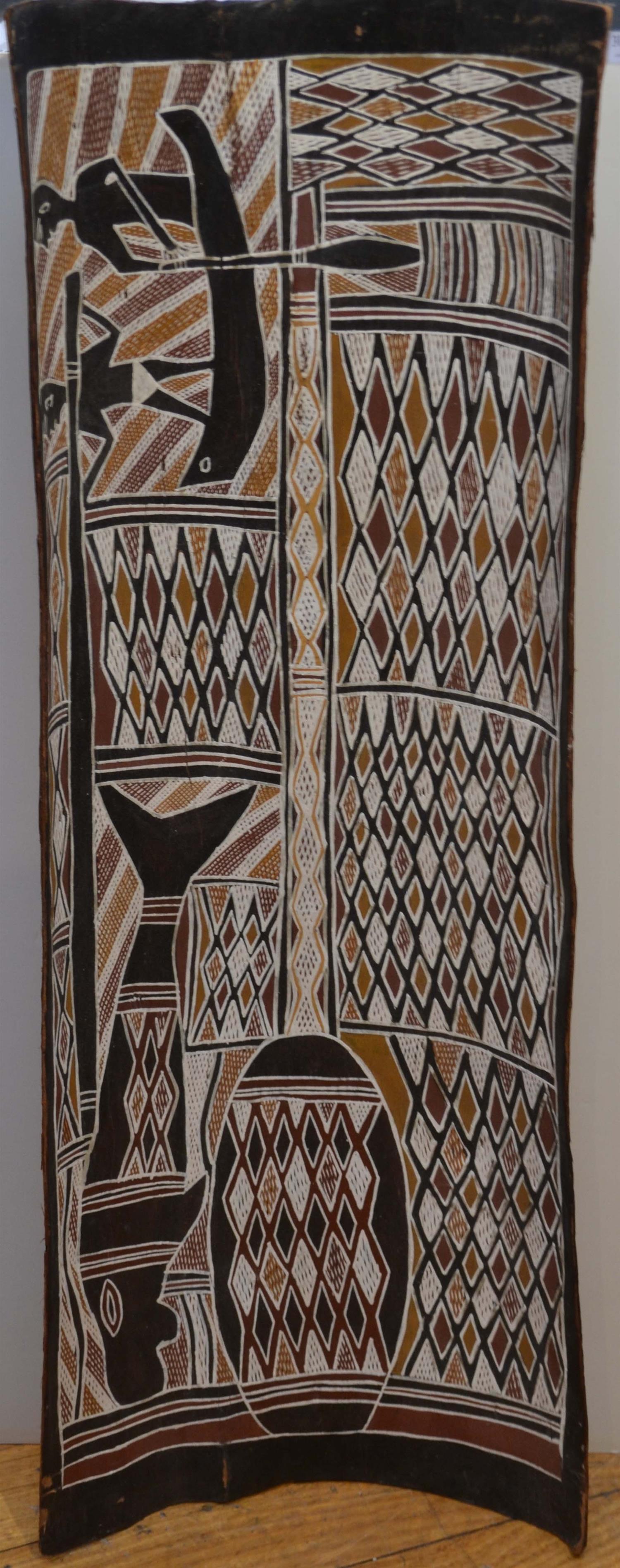 ARTIST UNKNOWN, INDIGENOUS BARK, ACRYLIC AND NAUTRAL EARTH PIGMETNS ON BARK, 100 X 35CM, CONDITION: PIGMENT LOSSES, SMALL CRACKS TO BARK