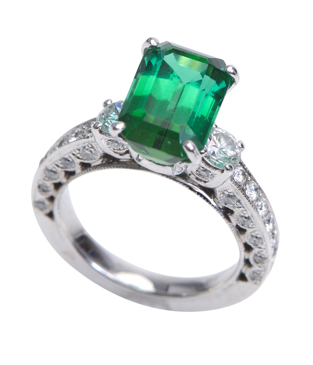 Featuring an emerald cut green tourmaline weighing 4.70cts, flanked by round brilliant cut diamonds totalling 1.10cts, in 18ct white gold, ring size I.