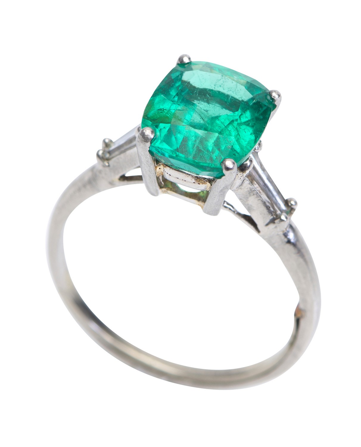 Featuring a cushion cut emerald weighing 3.09cts, flanked by tapered baguette cut diamonds, in platinum, ring size Q.