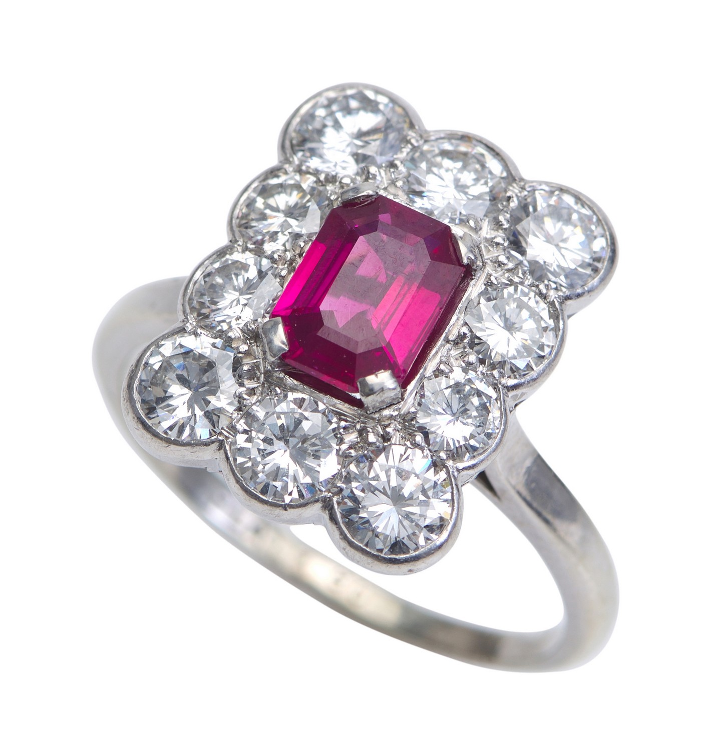 Of rectangular cluster design, centrally set with an emerald cut ruby weighing 1.01cts, surrounded by round brilliant cut diamonds totalling 1.75cts, in platinum, ring size N.