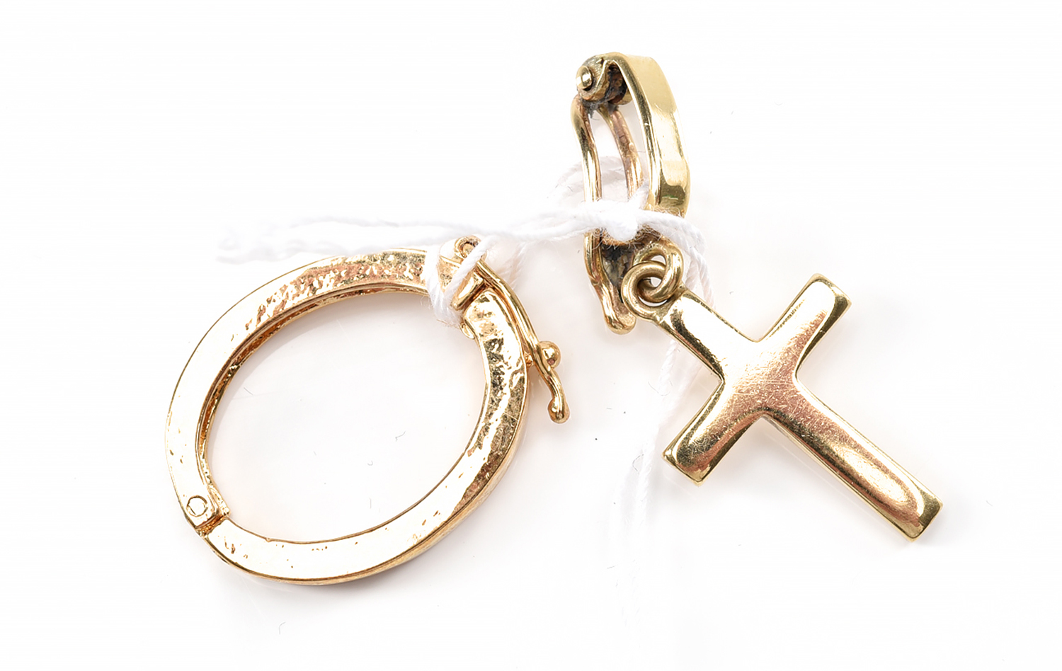 A CROSS PENDANT/ENHANCER IN 9CT GOLD TOGETHER WITH A GOLD TONE SCARF RING - Provenance : From the collection of Bambi Smith, Late Dowager Countess of Harewood
