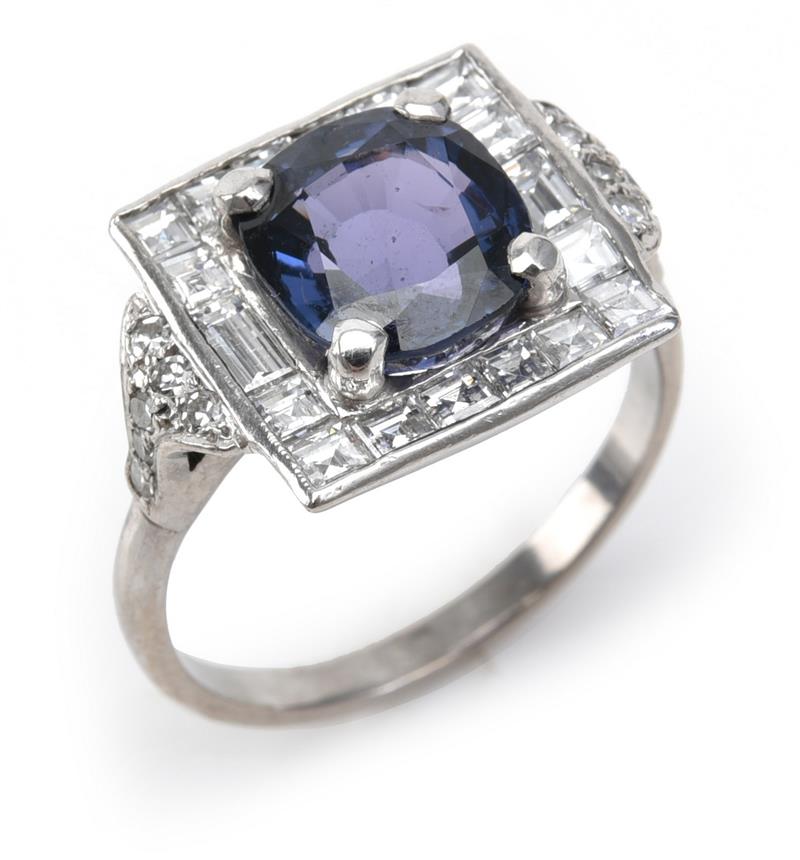 Of Art Deco style, featuring a cushion cut blue spinel weighing an estimated 3.50cts, within a border of emerald cut diamonds and shoulders set with single cut diamonds, in platinum, ring size N.