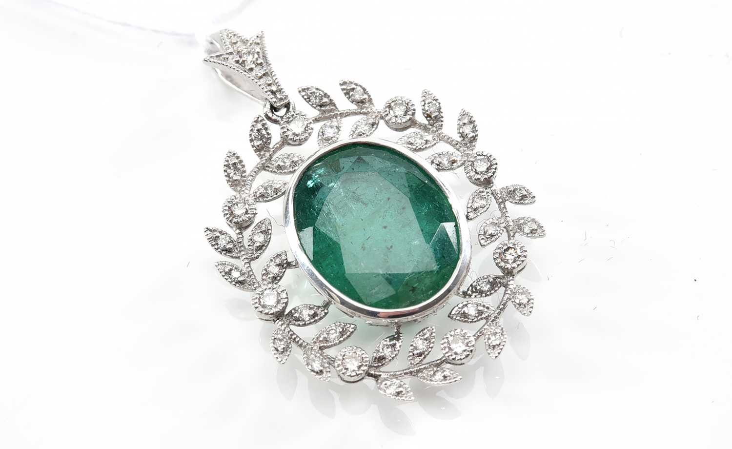 AN EMERALD AND DIAMOND PENDANT - Featuring an oval brilliant cut emerald weighing 8.31ct, surrounded by a foliate wreath set with forty one round brilliant cut diamonds totalling 0.64ct, in 18ct white gold.