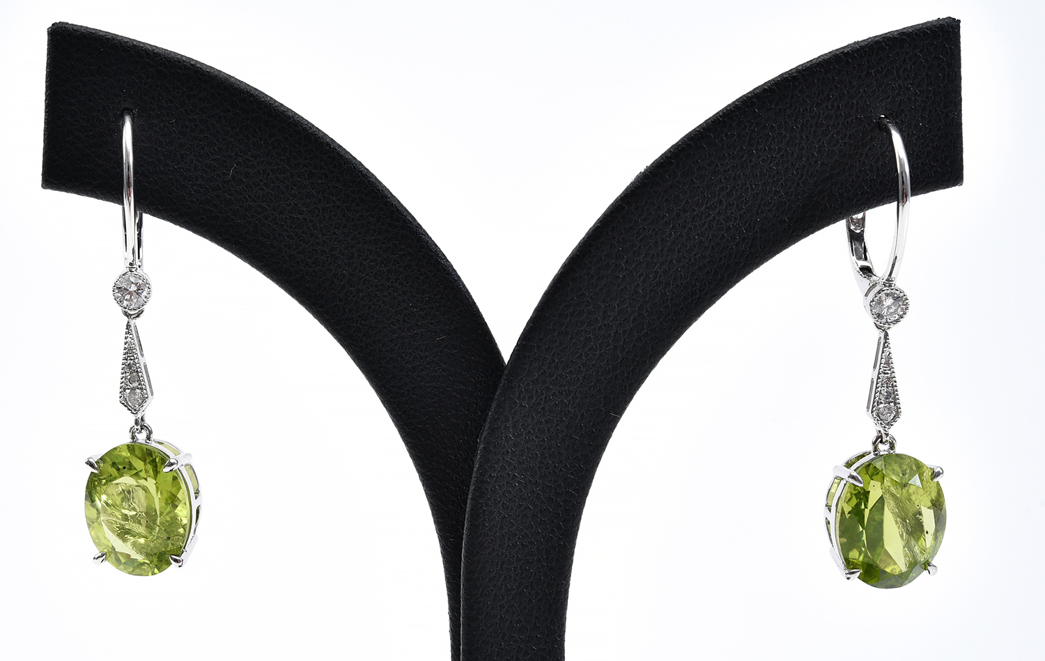 A PAIR OF PERIDOT AND DIAMOND DROP EARRINGS IN 18CT WHITE GOLD, LENGTH 35MM, 5.1GMS