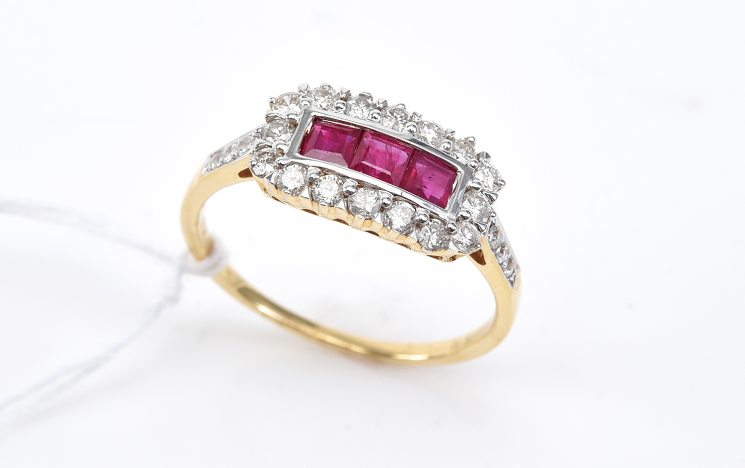 A RUBY AND DIAMOND DRESS RING - Featuring three carré cut rubies totalling 0.56cts surrounded by twenty two round brilliant cut diamonds totalling 0.50cts, in 18ct gold, ring size O1/2.