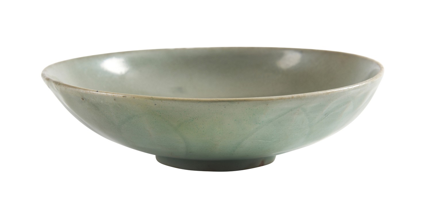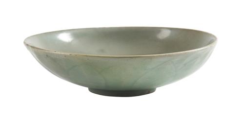 The shallow bowl with carved decoration of lotus petals to the exterior, covered in a greyish-green glaze.