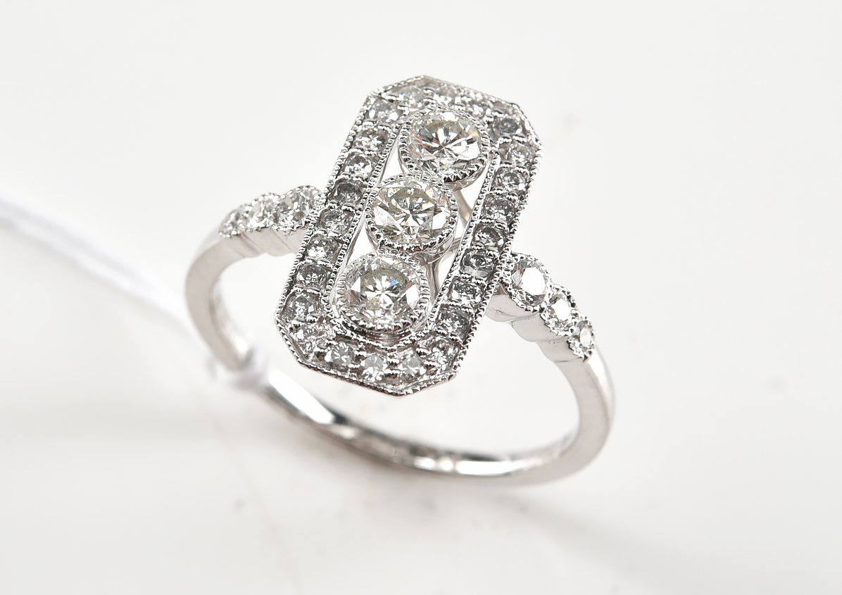 AN ART DECO STYLE DIAMOND PLAQUE RING IN 18CT WHITE GOLD, DIAMONDS TOTALLING 0.74CT, SIZE M, 2.7GMS