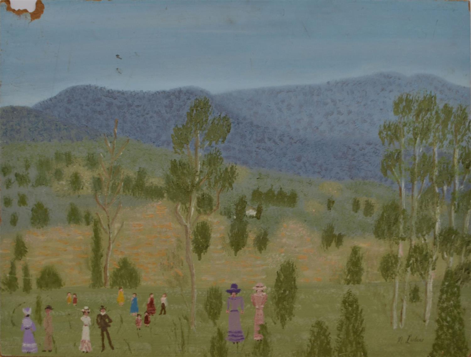 MURIEL LUDERS, DAY OUT, OIL ON MASONITE, 46 X 60CM, CONDITION: MAJOR LOSS UPPER LEFT CORNER (VISIBLE IN PHOTO), SOME PAINT LOSSES AND SURFACE SCRATCHES, UNFRAMED