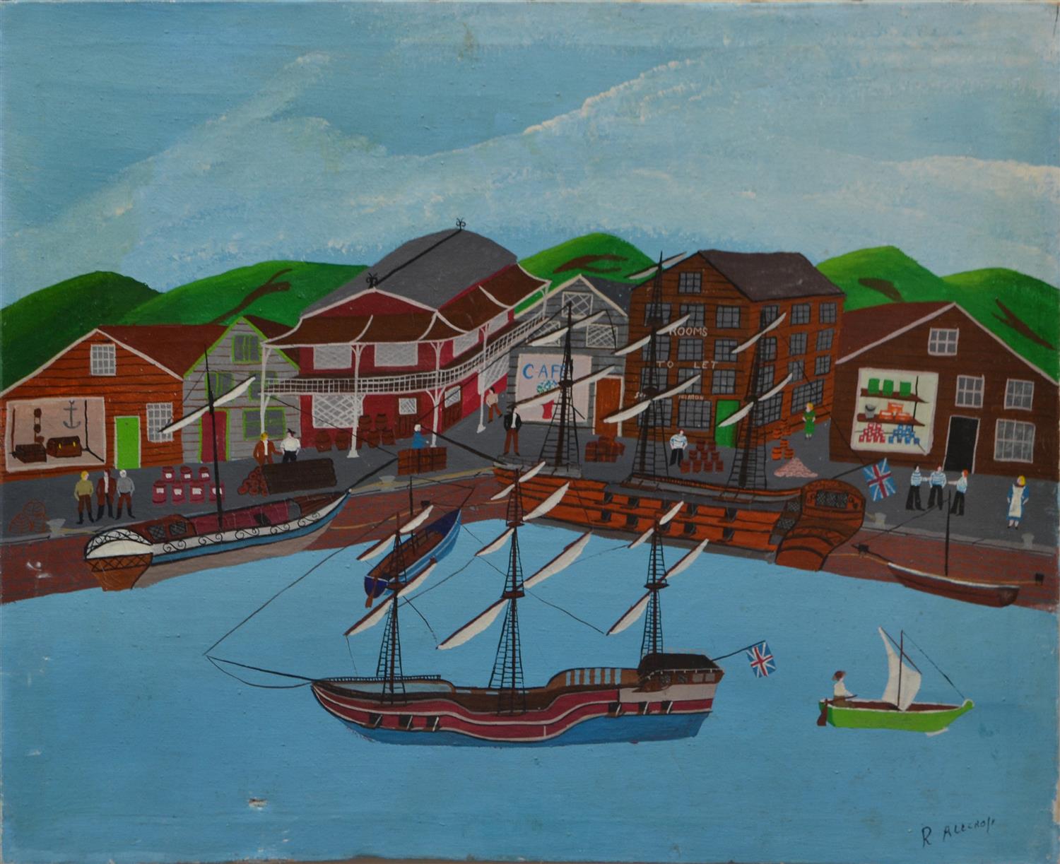 ROBERT ALLCROFT, BY THE DOCKS, OIL ON CANVAS, 45 X 56CM, NO ADDITIONAL FRAMING, CONDITION: WEAR TO EDGES, HOLE IN CANVAS LOWER LEFT, DISCOLOURATION