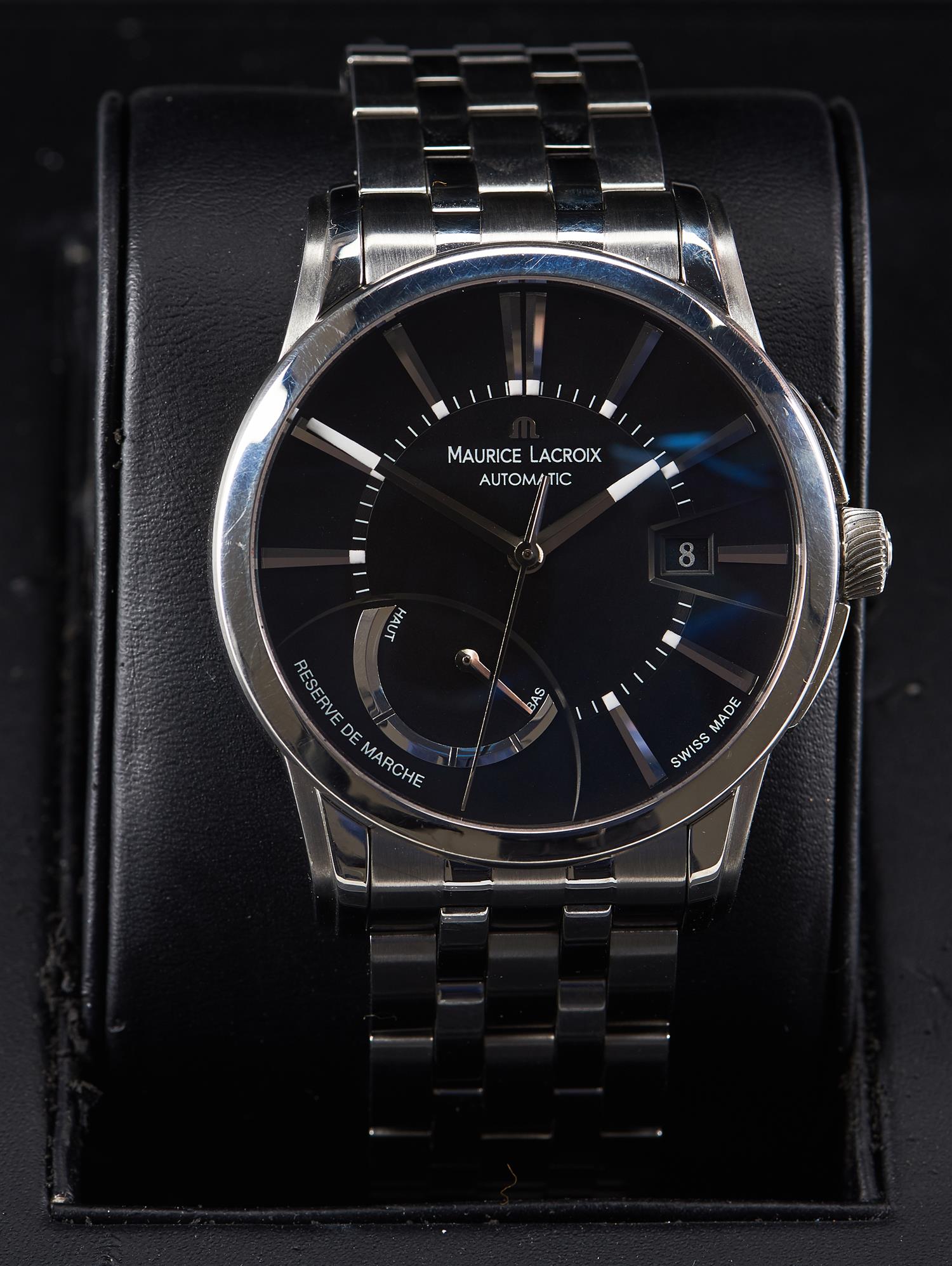 A WRISTWATCH BY MAURICE LACROIX - Automatic movement, circular black dial, with silver baton numerals, date aperture at three, subsidiary up and down dial at five, signed case, dial and movement, stainless steel case with glazed reverse and conforming bracelet bands, serial number AT93785, boxed with papers.