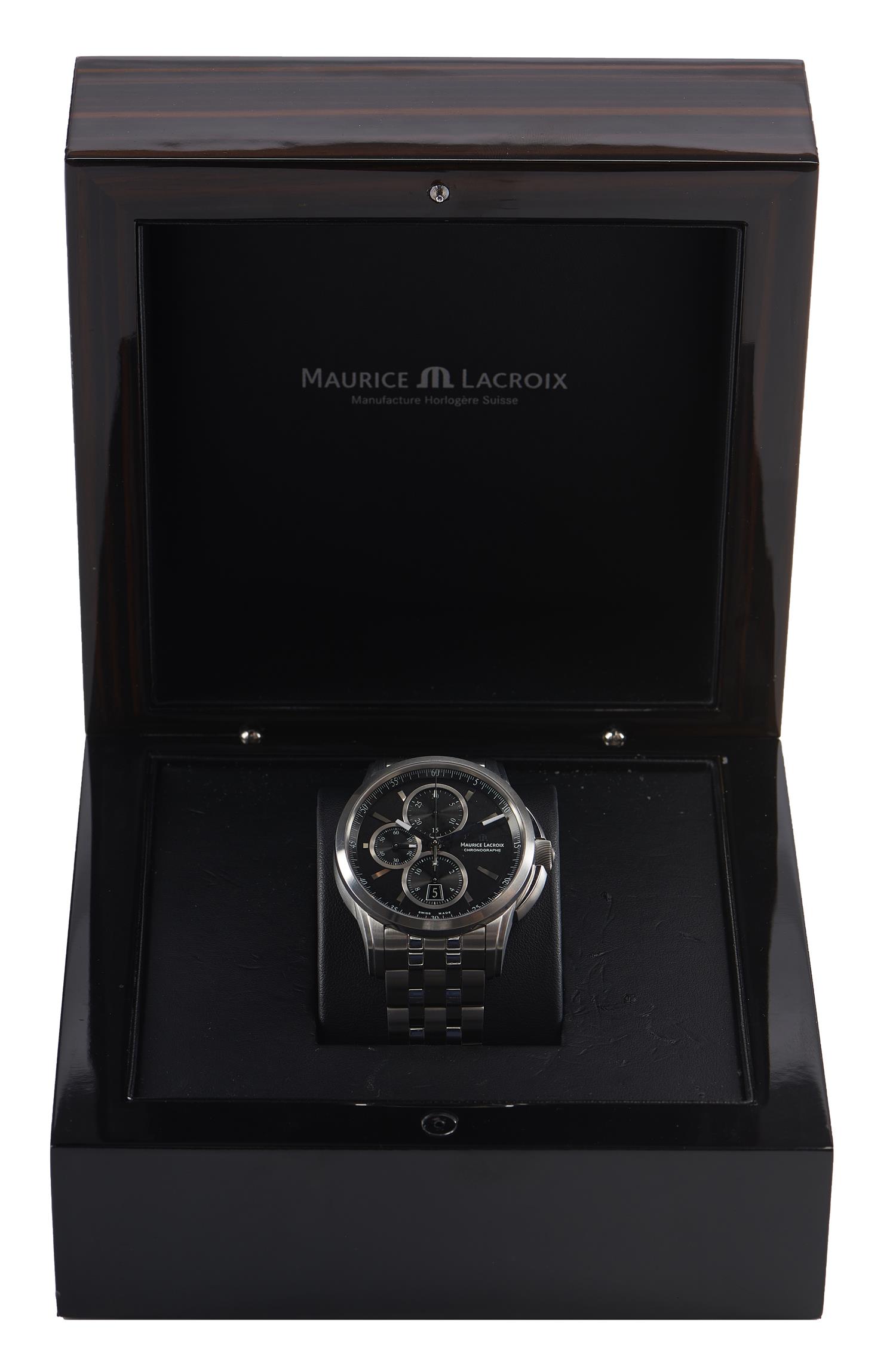 A CHRONOGRAPH WRISTWATCH BY MAURICE LACROIX - Automatic movement, circular black dial, with silver baton numerals, subsidiary dials at six, nine and twelve, date aperture at six, signed case, dial and movement, stainless steel case with glazed reverse and conforming bracelet bands, serial number AT09146, boxed with papers.