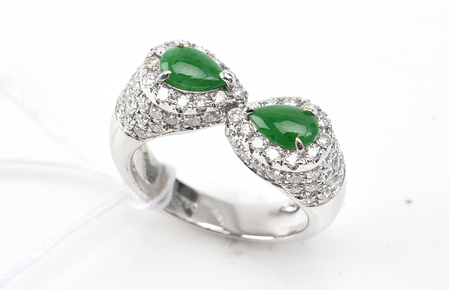 A JADE AND DIAMOND RING IN 18CT WHITE GOLD ACCOMPANIED BY A HKJSLL CERTIFICATE, RING SIZE M