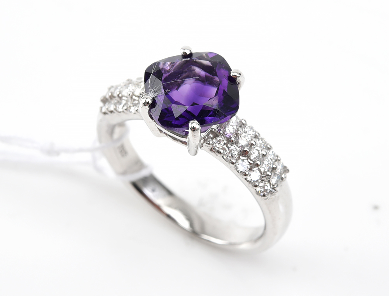 A CUSHION CUT AMETHYST AND DIAMOND RING IN 18CT WHITE GOLD, SIZE M, 5GMS