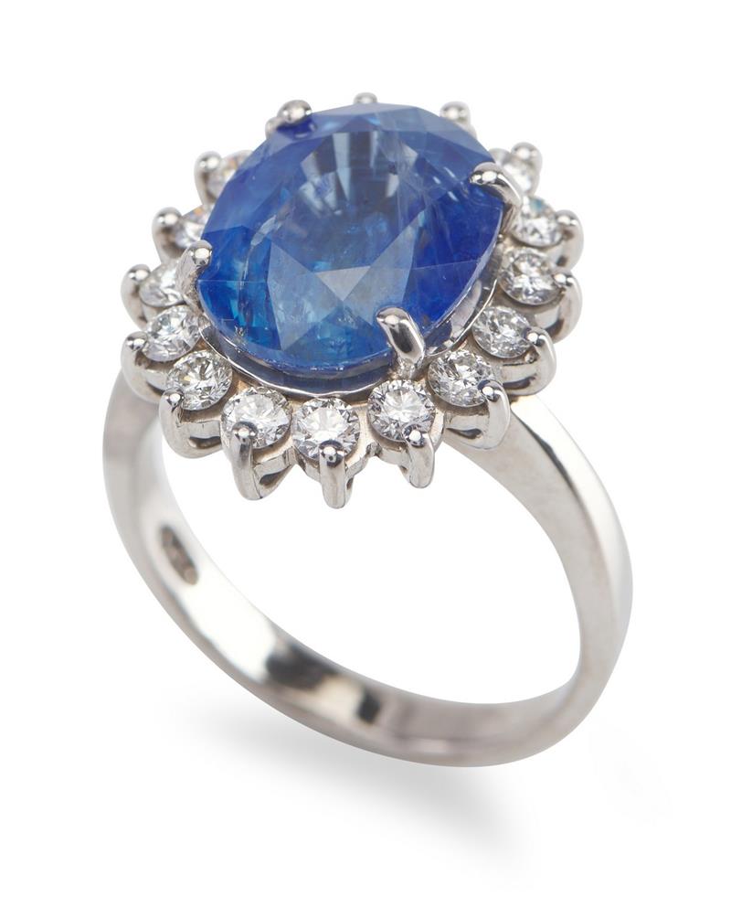 Featuring an oval sapphire weighing an estimated 6.92cts, surrounded by sixteen round brilliant cut diamonds totalling an estimated 0.60cts, in 18ct white gold, ring size M 1/2.